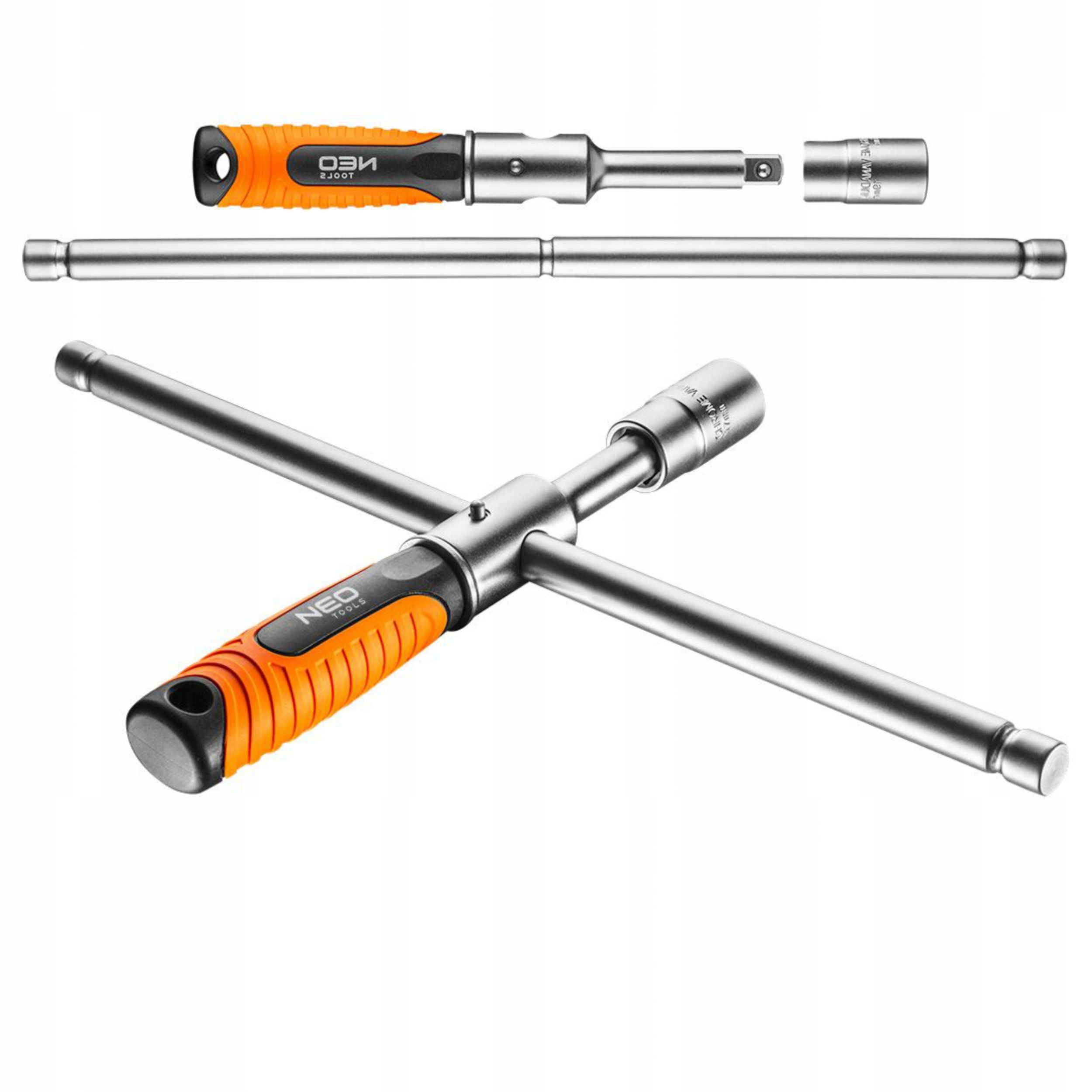 Ключ для дисків NEO (арт. № 11-101)з двостороннім ковпаком 17 і 19 мм. Гайковий ключ має зручну прогумовану ручку, яка покращує комфорт роботи, і ручку 1/2" із фіксатором для екстремальних положень. Конструкція ключа дозволяє легко транспортувати його, коли у вас мало місця для багажу. Виготовлений із міцного хром-молібдену сталь, що забезпечує довговічність.