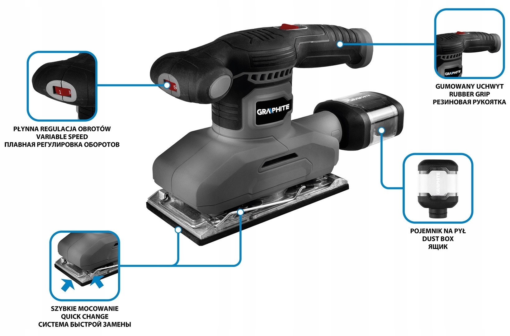 260 Вт коливальна шліфувальна машина, 90 х 187 мм 59g326 Графіт - це інструмент з 260 Вт з футом 90 х 187 мм. Він досягає швидкості від 7000 до 13000 хв. Набір з шліфувальною машиною пропонує 2 -кратні абразивні папери та пиловий контейнер. Вага пристрою - 1,7 кг. Ця модель шліфувальної машини відрізняється за допомогою не -ковзання, зручною для використання ручки, дренажної системи пилу та можливості швидкої заміни наждачного паперу. Він характеризується блокадою для безперервної роботи. Шліфувальна машина має практичний шнур потужності в 3 м довгим гумовим покриттям. Це інструмент, необхідний для подрібнення, полірування та ефективного видалення іржі або фарби.