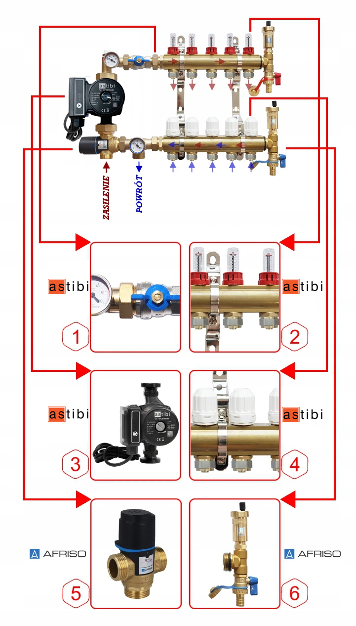 РОЗДІЛЬНИК НА 7 КОНТУРІВ ТЕПЛОЇ ПІДЛОГИ З КОМПЛЕКТОМ ЗМІШУВАННЯ З ЕНЕРГОЗБЕРІГАЮЧИМ НАСОСОМ ASTIBI