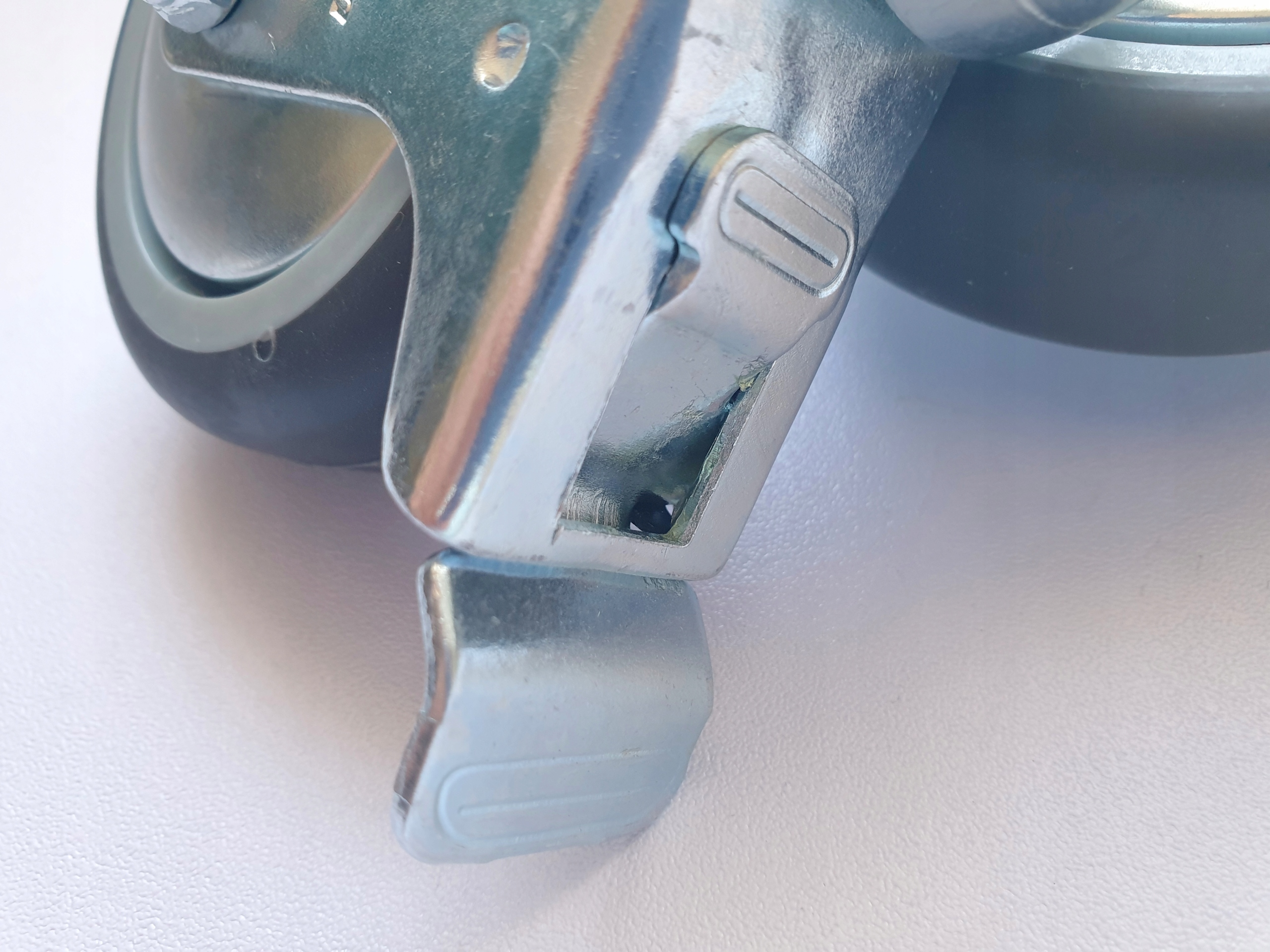 Колеса, встановлені на т.зв. Пластина являє собою комбінацію універсальної вилки з пресованого сталевого листа та колеса з поліпропіленовою втулкою та шиною з графітової термопластичної гуми без слідів. Поворотна головка вилки має подвійні підшипники. Всі металеві елементи комплекту покриті антикорозійним хромоцинковим покриттям. Гальмо блокує колесо та головку. Відомий виробник – глобальний концерн.