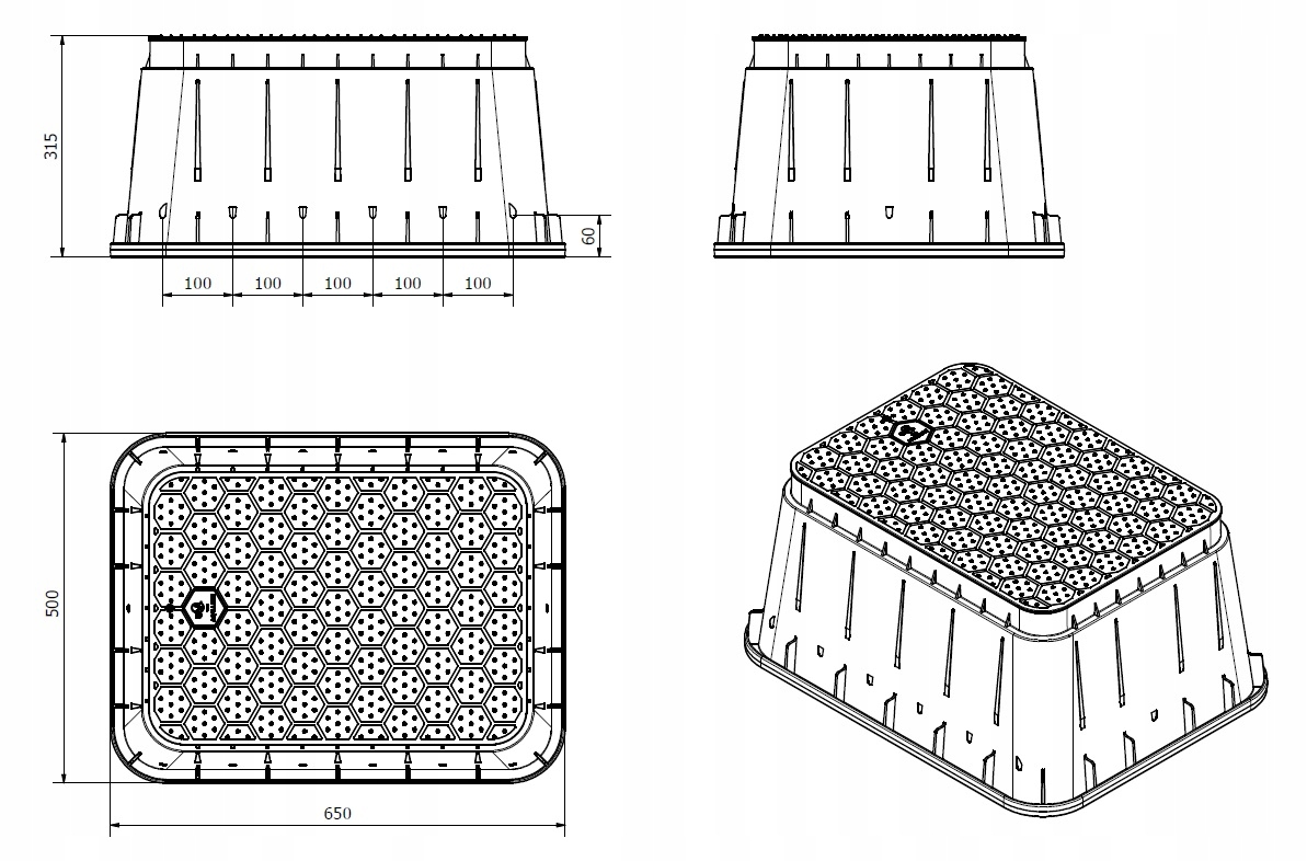 Клапанний колодязь JUMBO являє собою прямокутну коробку без дна з кришкою, що надягається та загвинчується.