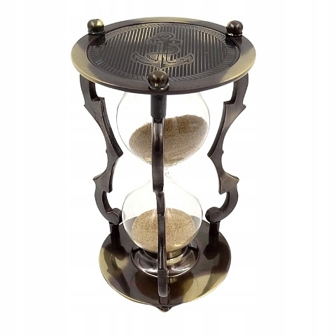 Пісочний годинник виготовлений з латуні, а скляні бульбашки наповнені ніжним бежевим піском. Його унікальний дизайн включає в себе декоративні ніжки і якір, розміщений на одній з основ. Точний час насипання піску становить приблизно 5 хвилин, що гарантує короткий, але ефективний відпочинок від повсякденних справ.