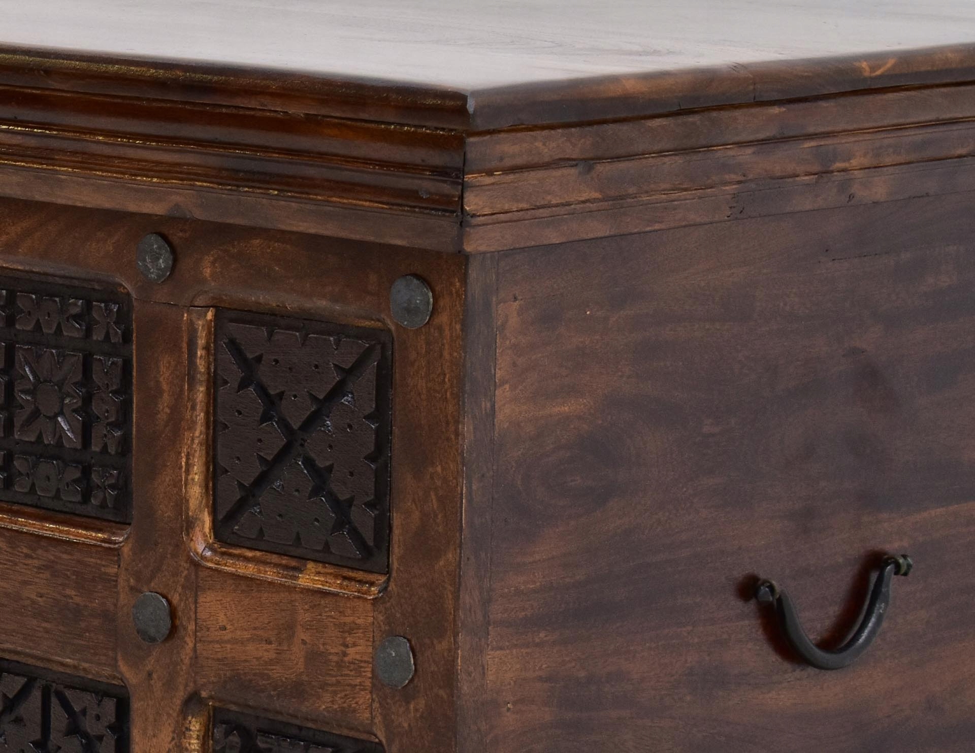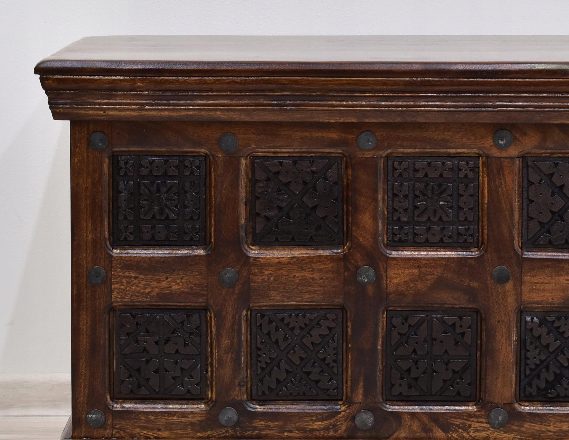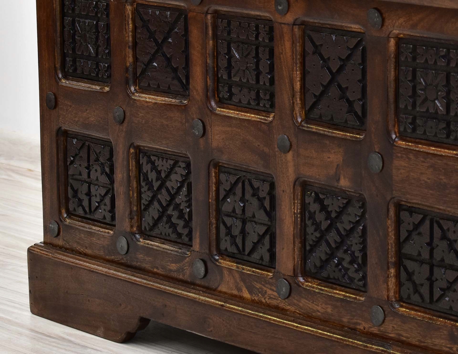 Стовбур ручної різьби, виготовлений із 100% твердого дерева індійської акації, пофарбований у темно-коричневий колір. Складні орнаменти в більш темних тонах надають дерев'яному стовбуру загадковий, східний характер. Індійську скриню з витонченими металевими ручками можна використовувати для зберігання речей, тому вона може стати функціональним предметом меблів для вітальні, спальні або залу. Його розміри 100/50/50 см. Багате різьблення, зроблене індійськими майстрами, робить кожен предмет унікальним.