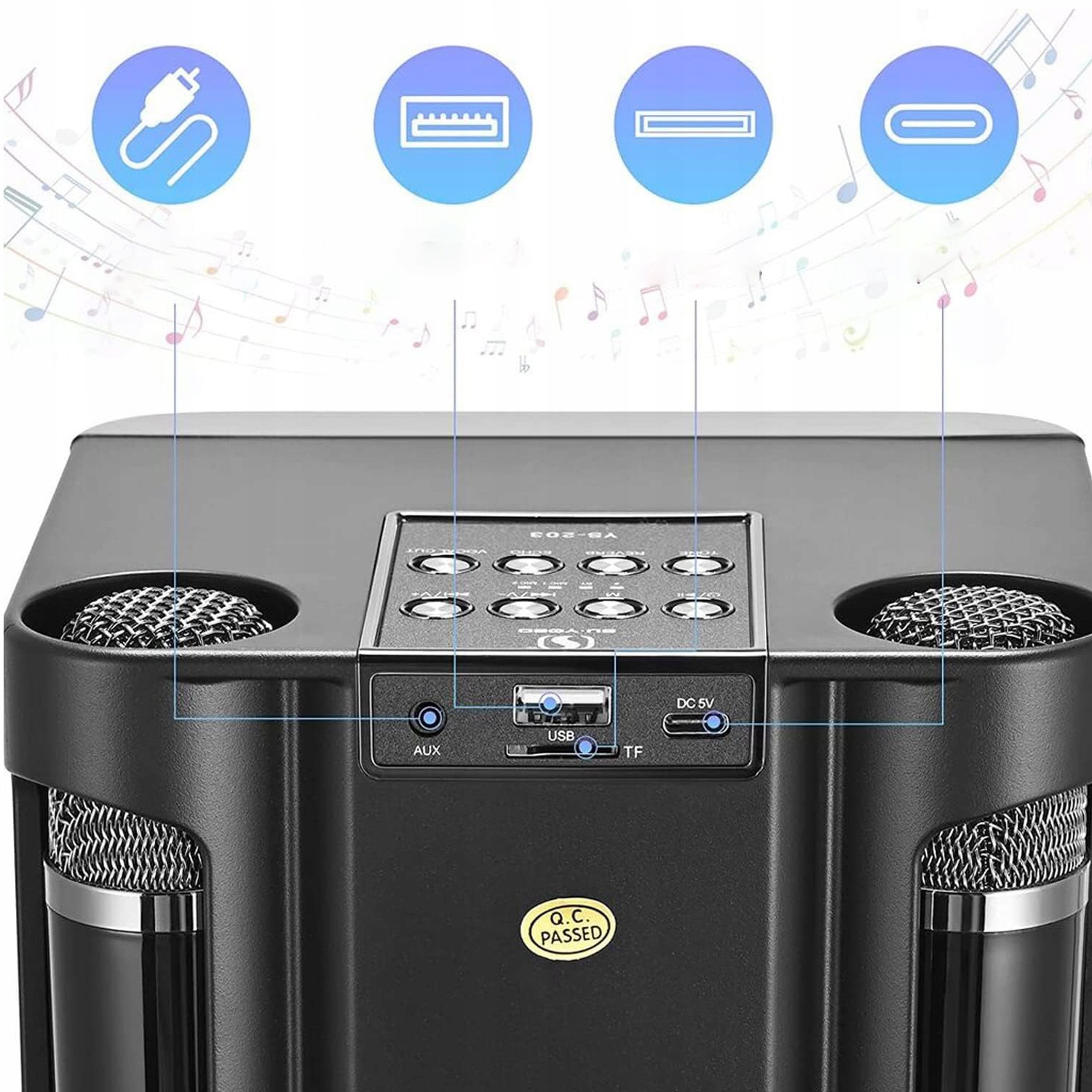 🎶 Колонка має вбудований високопродуктивний літій-іонний акумулятор ємністю 3000 мАг, який гарантує безперебійне відтворення музики до 8 годин із гучністю 50%, а мікрофон має вбудований літій-іонний акумулятор ємністю 1200 мАг -іонний акумулятор.