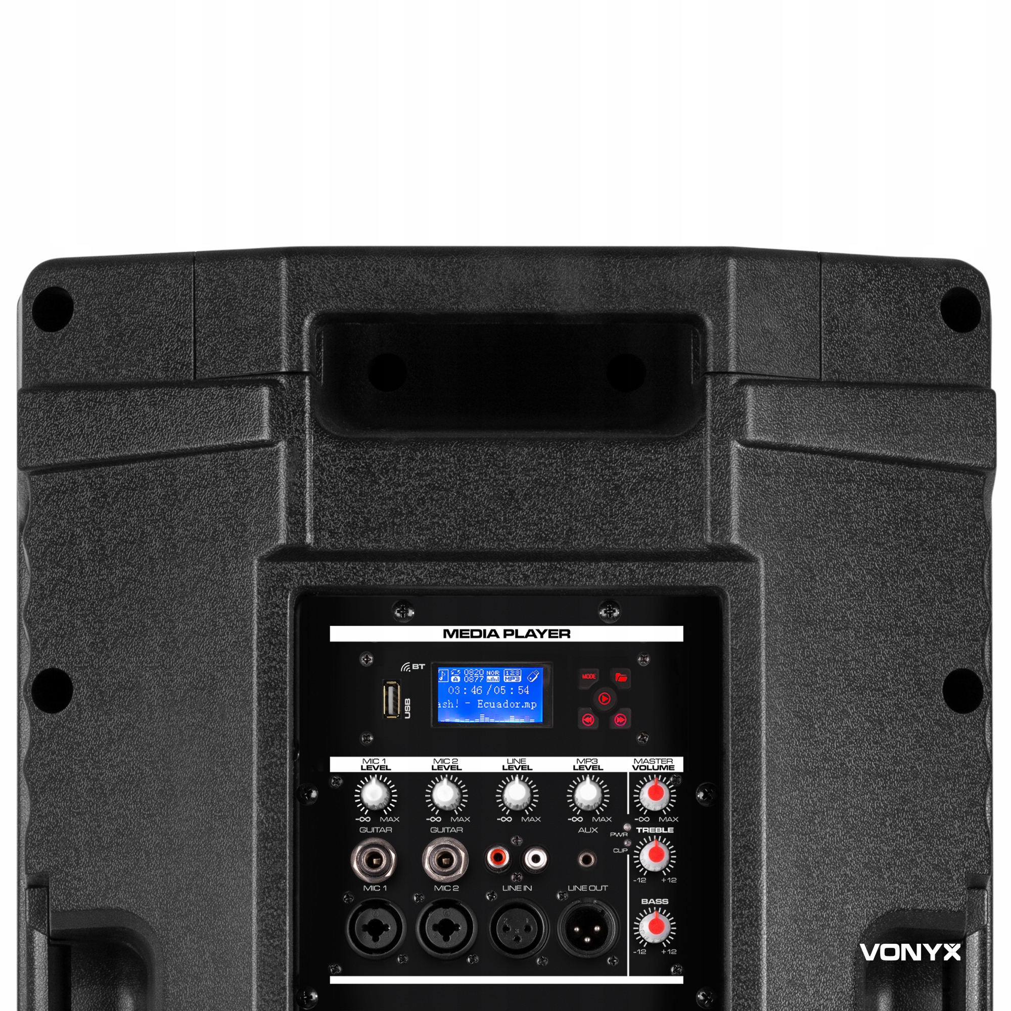 складається з серії гучномовців високої потужності з 2 вбудованими підсилювачами (НЧ-підсилювач і ВЧ-підсилювач) для чудової продуктивності. Вбудований підсилювач оснащений BT-ресивером і USB-портом для програвання MP3-файлів, яскравим РК-дисплеєм з тегом ID3. Колонка розроблена з міцної поліпропіленової конструкції, щоб впоратися з потужністю, але при цьому досить легкою для мобільного використання.