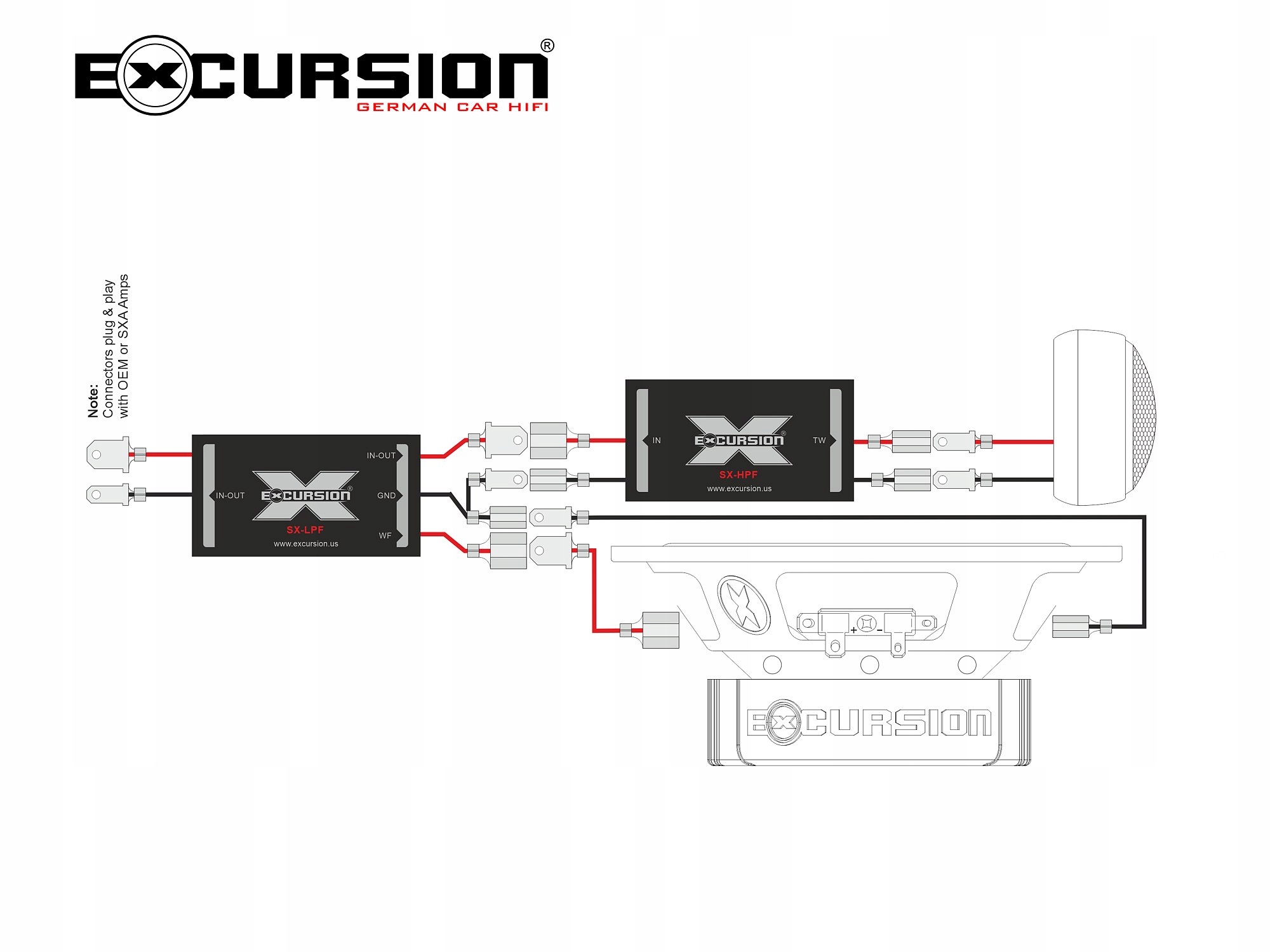 Двосмугова розділена автомобільна акустична система з 165-мм низькочастотними динаміками серії Excursion SX (S b>treet eXcursion), що представляє дуже зрілий і динамічний характер звуку, який часто притаманний лише динамікам, які пропонуються за набагато вищою ціною. Звук секції середнього високочастотного динаміка насичений деталями, які створюють чистий і чітко відчутний просторовий звуковий образ, який базується на твердій і міцній основі баса, побудованому низькочастотними динаміками. Завдяки цим характеристикам колонки Excursion SX-6C безперечно можна вважати одними з найкращих за звучанням комплектів у цьому ціновому класі. У набір входять 2 високочастотні динаміки, 2 динаміки середніх басів і 4 кросовери Plug&Play окремо для кожного динаміка. Кросовери оснащені високоякісними конденсаторами MKP і забезпечують широкий спектр конфігурацій підключення (наприклад, Bi-Wiring, Bi-Amping). Магніти НЧ-динаміків мають центральні отвори для вентиляції і зниження резонансної частоти (FS) і додаткового підвищення ефективності системи охолодження котушки. Вуфери оснащені діафрагмами ADC Matt другого покоління, зовні покритими матовою чорною антирезонансною речовиною, яка, крім стандартного зменшення спотворень звуку, більш благотворно впливає на лінійність високих середніх тонів (заспокоює найбільш «шумний» діапазон) і додатково захищає діафрагму від вологи і робить НЧ-динаміки набагато професійнішими. Ці діафрагми також мають спеціально розроблені пилозахисні ковпачки у стилі фазових еквалайзерів, завдання яких — покращити звучання середніх тонів у разі занадто великого кута прослуховування (наприклад, коли дверні НЧ-динаміки розташовані низько).