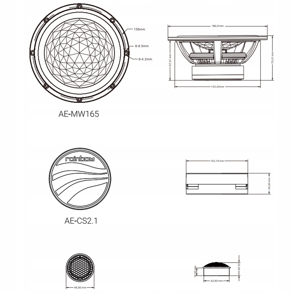 Діафрагма низькочастотного динаміка AE-MW165, яка використовується в комплекті Rainbow Audio AE-C260 Anniversary Edition, виконана у вигляді «кристалічного конуса» — кристалічної діафрагми зі спеціальною структурою, розробленою за технологією CM-XR (Crystal Membrane — Extended Range Technology). Ця конструкція діафрагми характеризується підвищеною жорсткістю та демпфуванням завдяки унікальному процесу лиття та кристалічній структурі, що покращує лінійність частотної характеристики, зменшує резонанси та забезпечує більшу точність звуку.