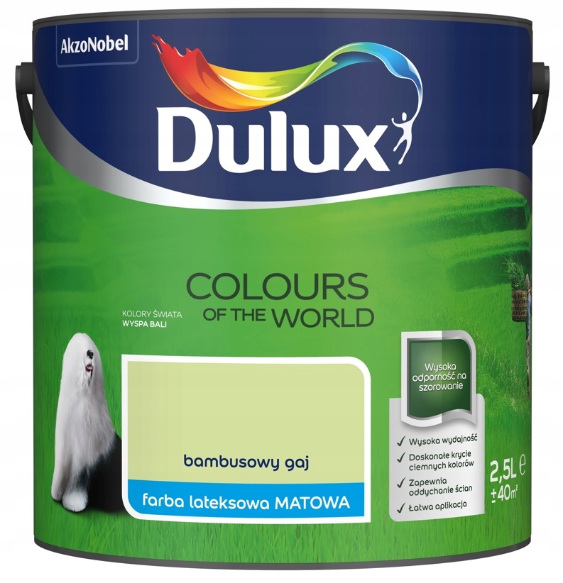 Dulux фарбує кольори світового бамбука, 2,5 л. Це створює покриття з дуже високою стійкістю до очищення, задовольняючи найвищі вимоги. Мікропорична структура покриття дозволяє дихати стінами (належна мікросифікація підкладки). Технічний - Продуктивність: 16m2/л з одним шаром