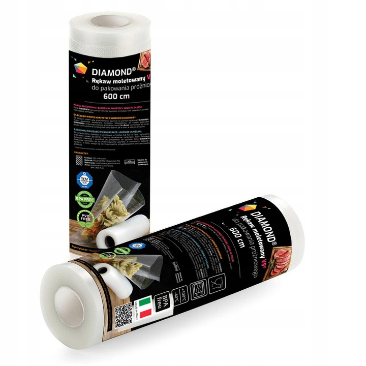 DIAMOND® використовуються для вакуумного пакування, для пакування в зовнішніх вакуумних пакувальних машинах. Дуже добре підходять для упаковки: м'яса, нарізки, молочних продуктів, риби, овочів, фруктів, мистецтва. делікатес. Сумки, які ми пропонуємо, мають декларацію відповідності нормам Європейського Союзу. Висилаємо сертифікат за бажанням покупця. Вони використовуються для захисту харчових продуктів. Призначений для пакування та зберігання м'яса, нарізки, риби, делікатесів, молочних продуктів, овочів і фруктів у сирому та вареному вигляді. Мають хороші бар'єрні властивості. Підходять для упаковки інших предметів: тканин, документів, мистецтва. медичні та інші дрібні предмети. Пакети, виготовлені з високоякісного двошарового матеріалу, що гарантує надійне ущільнення та підтримку стабільного вакууму навколо продукту.