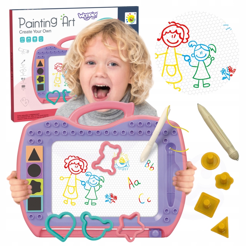- магнітна дошка дає вам можливість творчо розважатися протягом тривалого часу! Дошка заохочує писати та малювати. Малювання допоможе зосередитися, заспокоїти і заспокоїти дитину. Scribble дозволяє створювати нескінченну кількість малюнків - просто перемістіть спеціальний повзунок, і малюнок зникне, і ви зможете малювати знову! Також в набір входить зручна чарівна ручка, 4 штампи і 4 шаблони, які урізноманітнюють роботу. Дошка має зручну ручку, тому ваша дитина може брати її куди завгодно. Опис розвине ручні навички, уяву, творчі здібності вашої дитини та дасть вам шанс розвинути художню сторону вашої дитини!