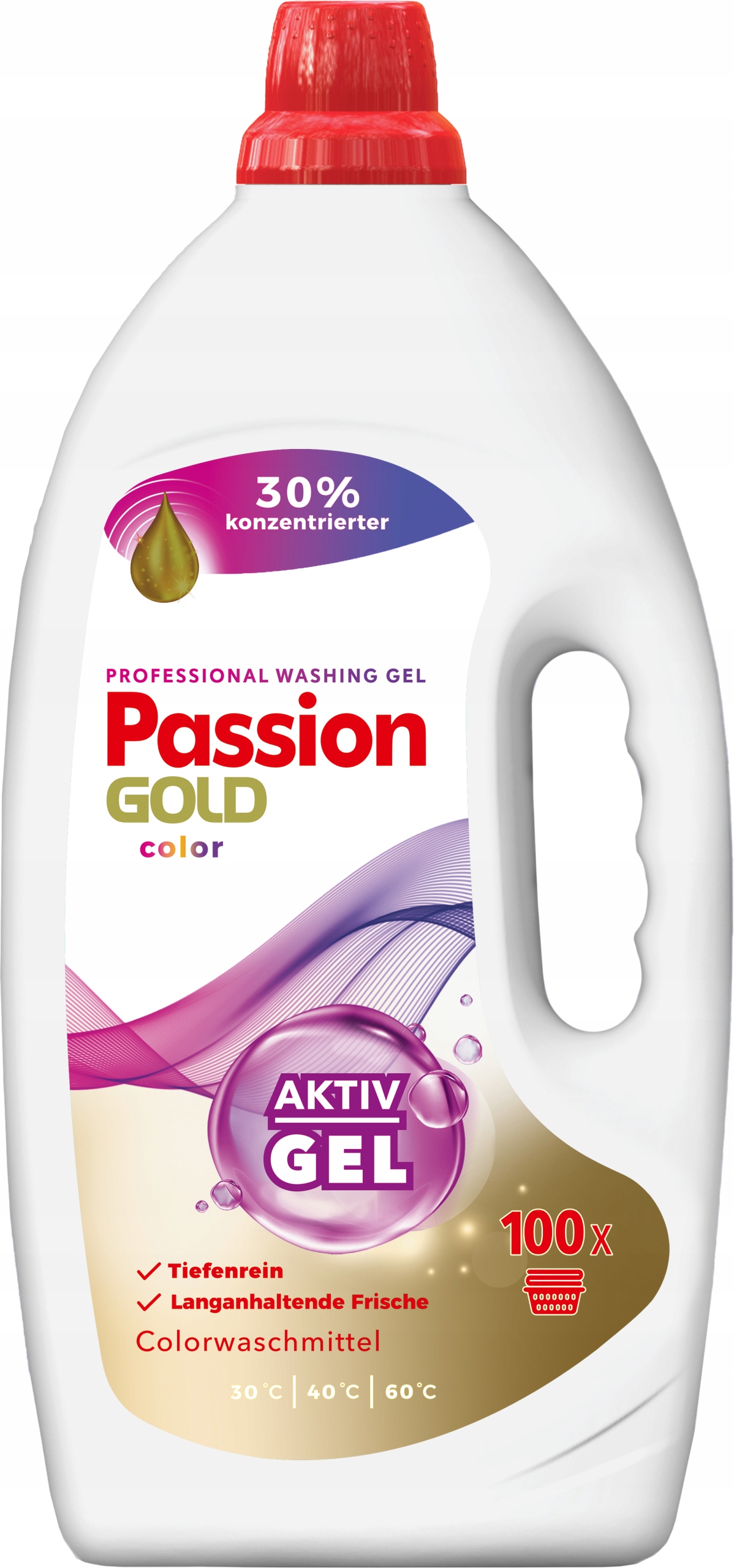 Професійний і дуже ефективний гель для прання Passion Gold Professional Color Aktiv Gel. Інноваційна миюча формула, глибоко проникаюча в волокна. Надає випраним тканинам приємний свіжий аромат. Містить активні ензими, які підтримують і полегшують прання. Для всіх типів пральних машин і для ручного прання. Температура від 30°C до 60°C.
