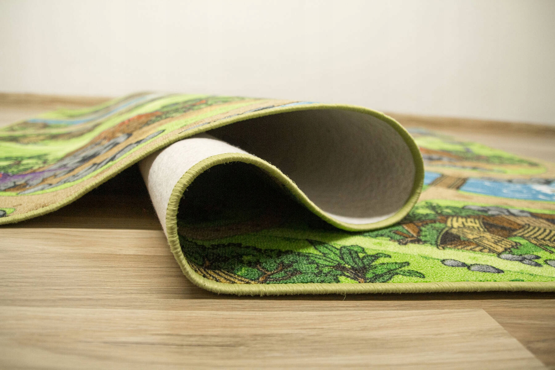 Дитячий килимок DINO прикрашений привабливим малюнком, сповненим кольорів та енергії, натхненним доісторичним світом динозаврів. Килим показує величезну землю, повну звивистих річок, стежок, вулканів, скель і дерев'яних поселень, між якими розташовані різноманітні силуети динозаврів. Все це створює візерунок, який заохочує до гри та стимулює уяву дитини.