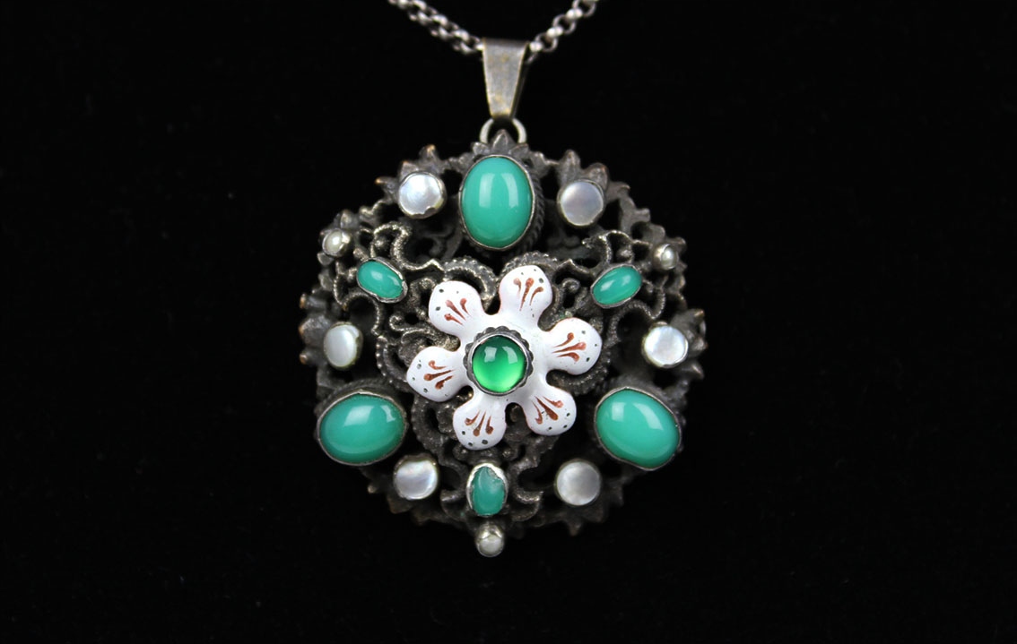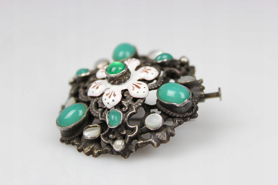 Вражаюча, надзвичайно вражаюча підвіска-брошка початку 20 століття, виготовлена в Австро-Угорській імперії. Ажурна конструкція з посрібленої латуні з емальованим центральним елементом, покритим перламутром, смарагдом і хризопразовим склом. На всьому є стара патина. Розміри: