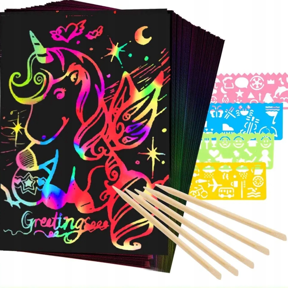Просто скористайтеся дерев’яними паличками, щоб зішкрябати чорну фольгу, щоб побачити чудові кольори веселки. Чорний порошок на скретч-папері та наконечниках можна легко стерти після малювання.