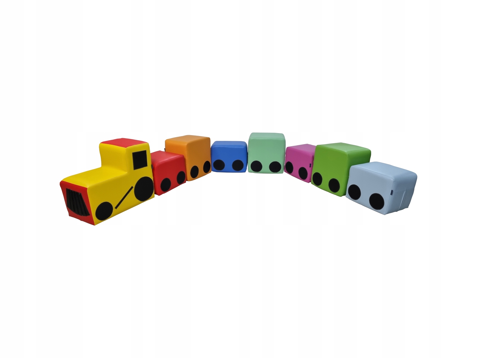 Барвистий потяг - набір реабілітаційних фурнітури - зручні сидіння для наймолодших, можна використовувати для того, щоб сидіти або складати різні набори сидіння, кути читача в місцях, призначених для відпочинку чи дітей. Обкладинки виготовлені з високоякісного матеріалу з ПВХ -без ПВХ покриття та використовуються для медичних пристроїв, що робить його дуже простим для очищення та дезінфекції. Набір включає locomotive та 7 вагонів у двох розмірах.