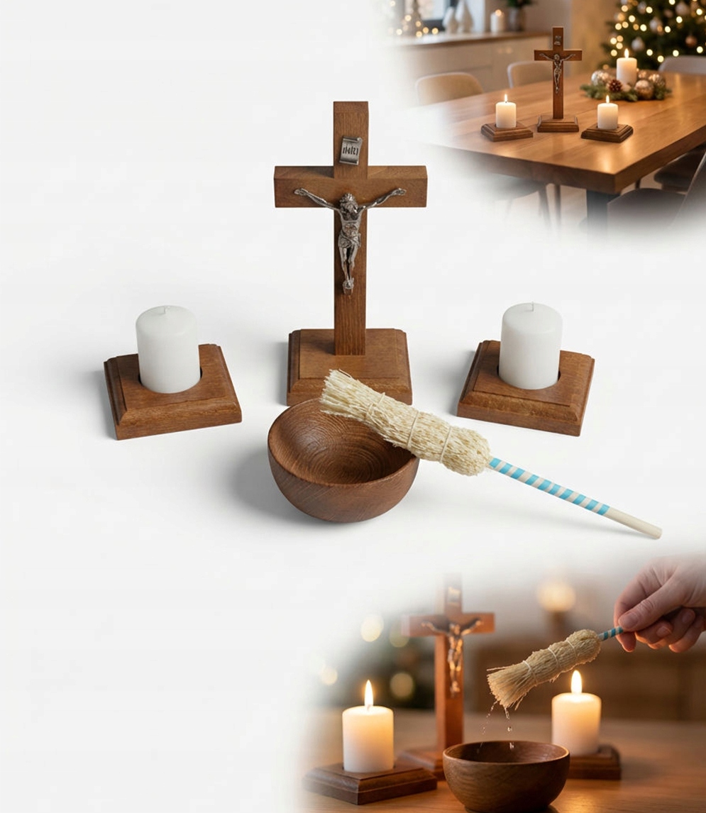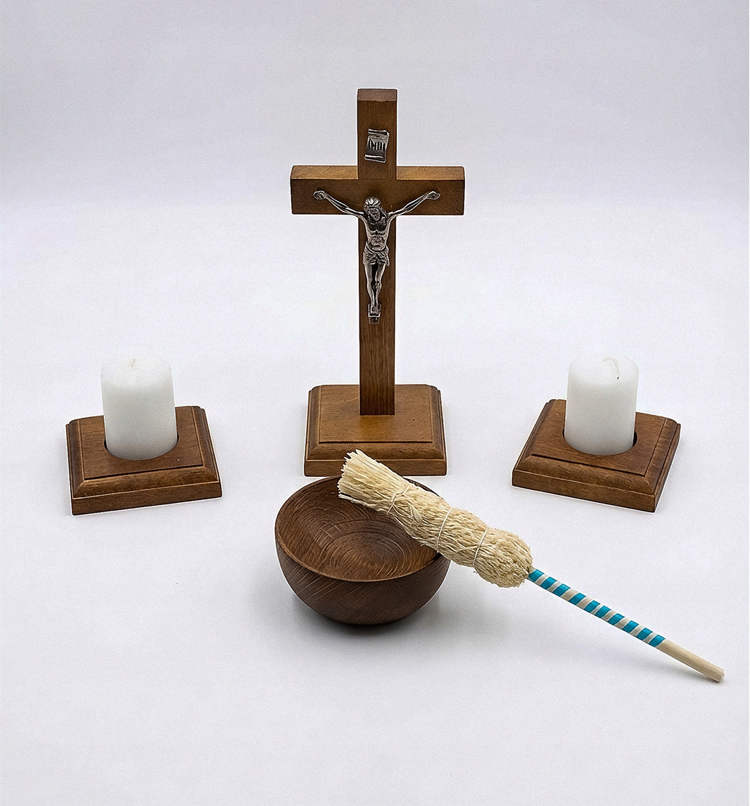 У набір входить хрест із металевим корпусом, два свічники з білими свічками, чаша для свяченої води та традиційне кропило. Елементи можна об’єднати, створивши єдиний домашній вівтар, або використовувати окремо. Все це упаковано в естетичну коробку з натуральним наповнювачем, що робить його також ідеальним у якості подарунка.