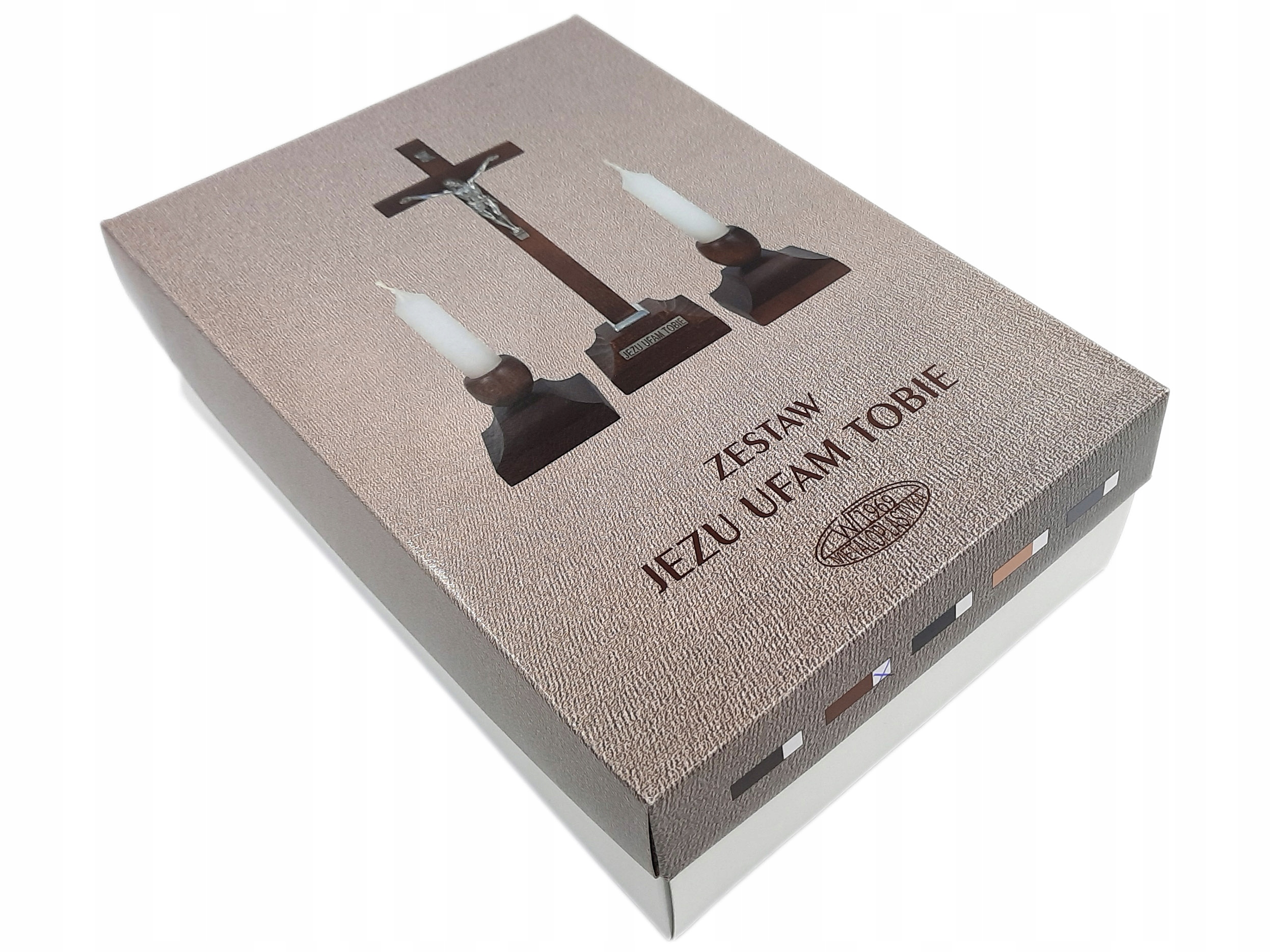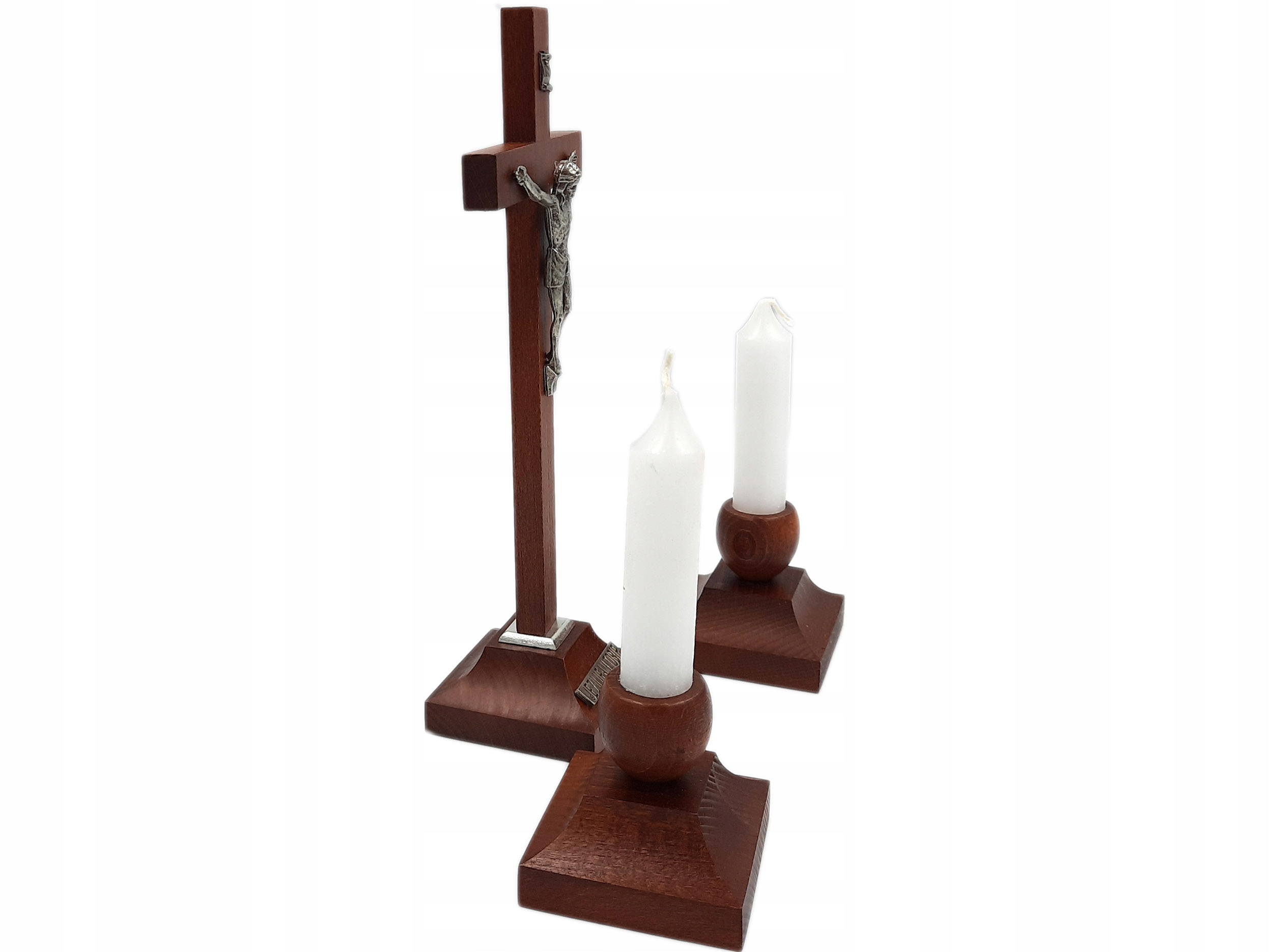 Набір складається зі стоячого дерев'яного хреста висотою 22 см та двох підсвічників для настільних свічок.