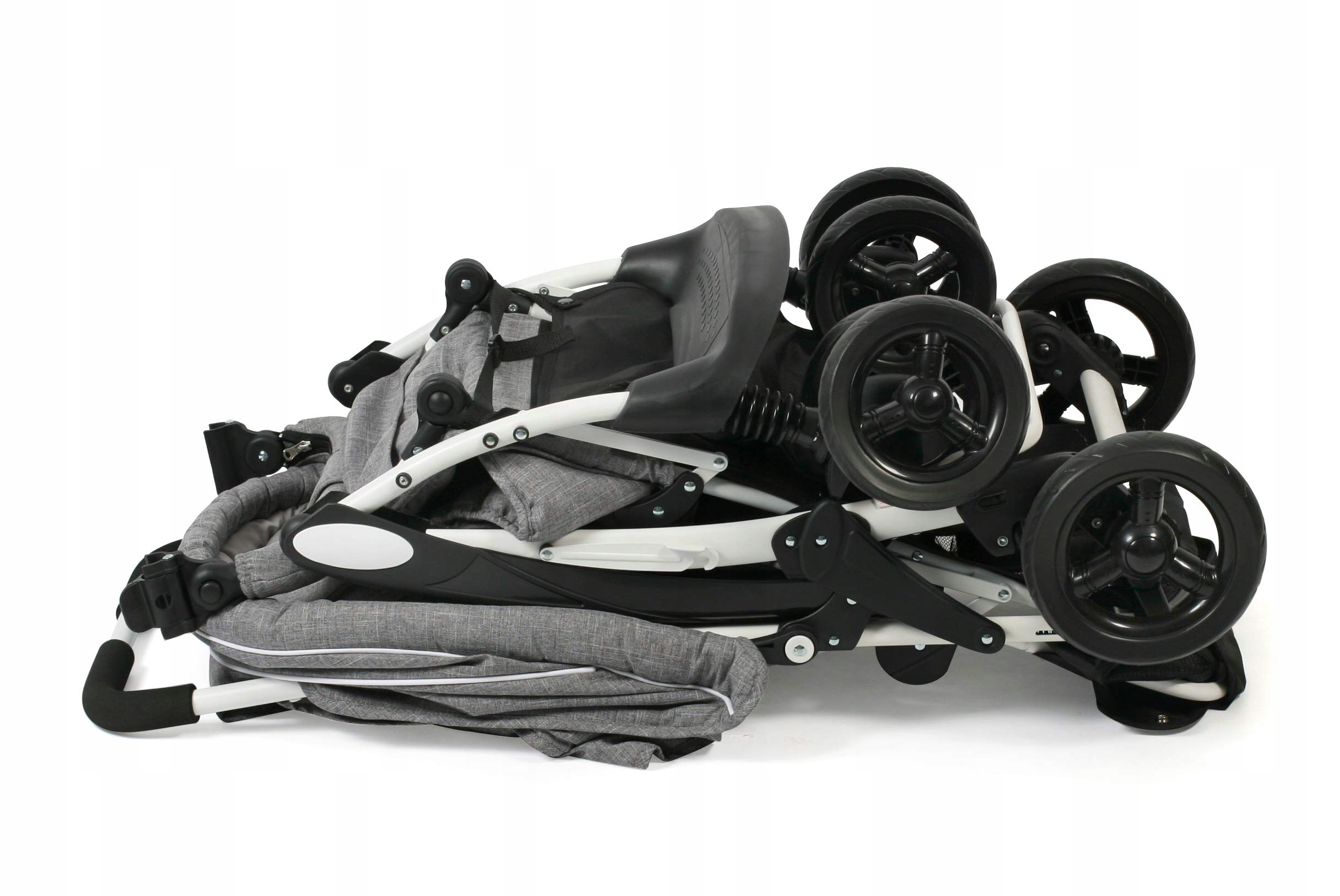 - крапка: зручна коляска для брата та сестри з просторою дитячою сумкою та дощовиком., Стабільна , 4-х пружинна рама з колесами з повітряними камерами., 5-ти точковий ремінь безпеки з наплічниками на обох сидіннях., Велика багажна корзина з бічними блискавками. швидке для легшого завантаження та розвантаження, 3-ступеневе регулювання спинки заднього сидіння до лежачого положення та 2-ступеневе регулювання спинки переднього сидіння до розслабленого положення.