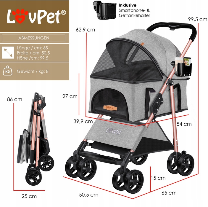 Коляска LovPet Dog - зручна і легка в штовханні завдяки амортизаторам, ідеальна для маленьких і середніх собак і кішок. Він складається одним рухом, оснащений міцною та стабільною сталевою рамою, великим кошиком для ласощів і ковдр і дощовиком на випадок поганої погоди.