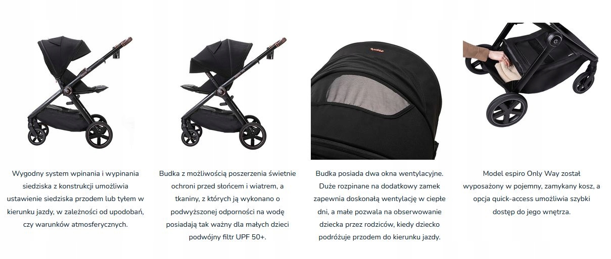 Espiro Only Way — це коляска вагою до 22 кг із сидінням, спрямованим вперед і назад, для будь-якої місцевості з великим закритим кошиком, вбудованою москітною сіткою, сумкою та тримач для чашки. Красиві, модні плафони, якісні тканини.