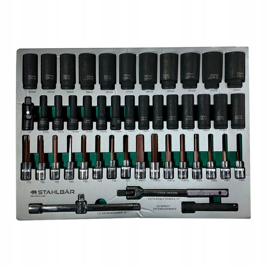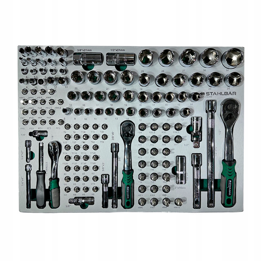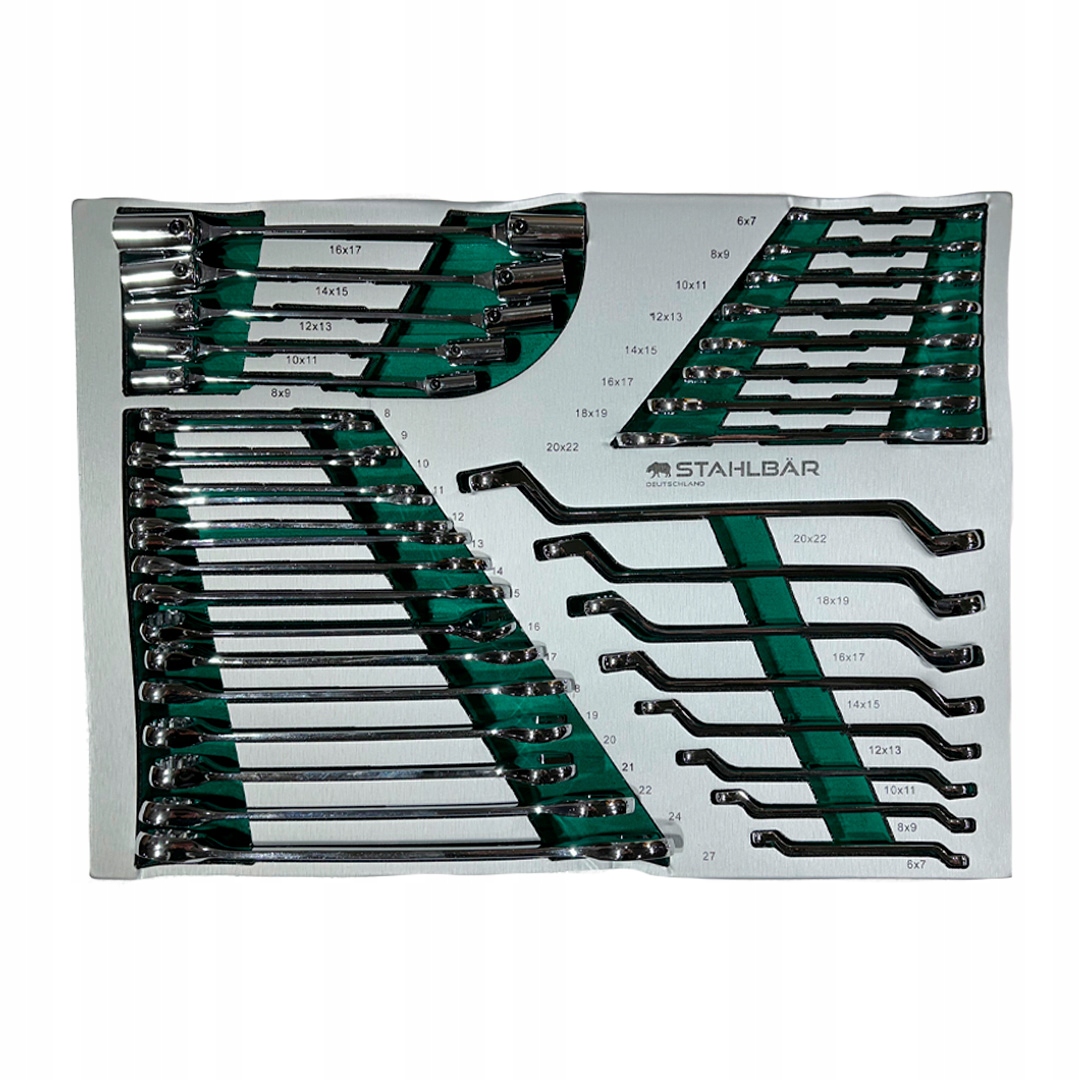 ящик 2-сетів гайкових ключів: 25 вкладень, універсальні суглоби, розширення та смуги. розміри.