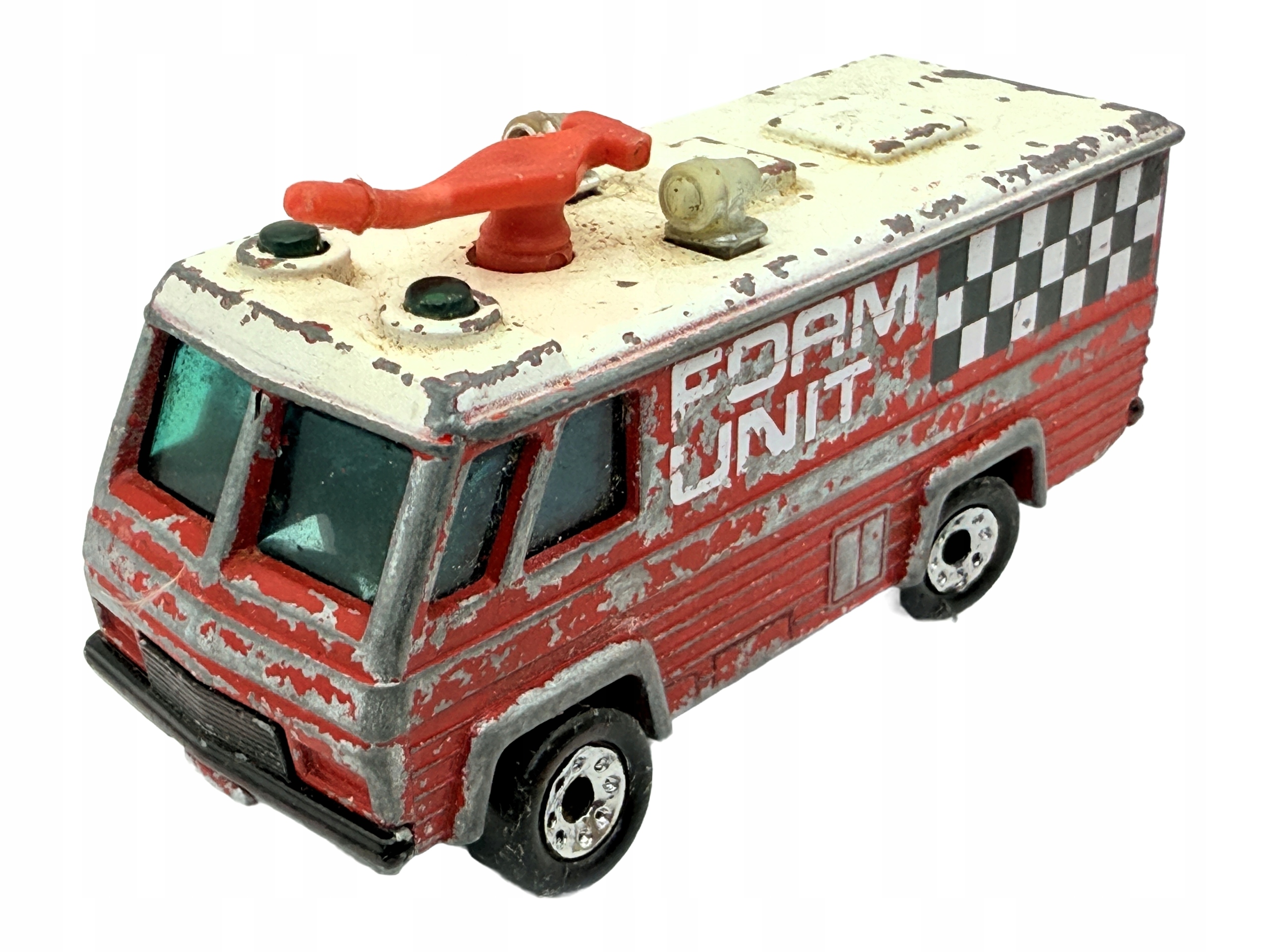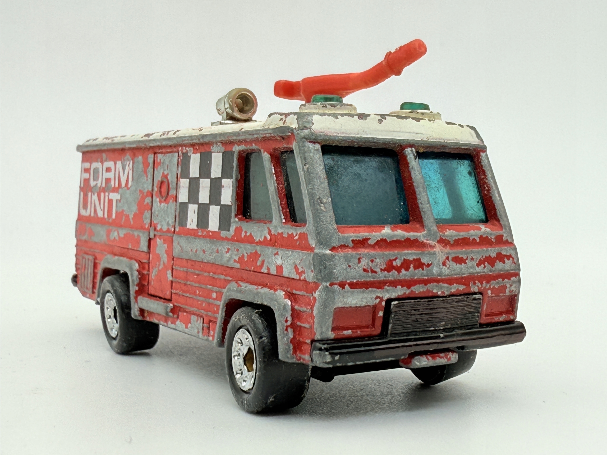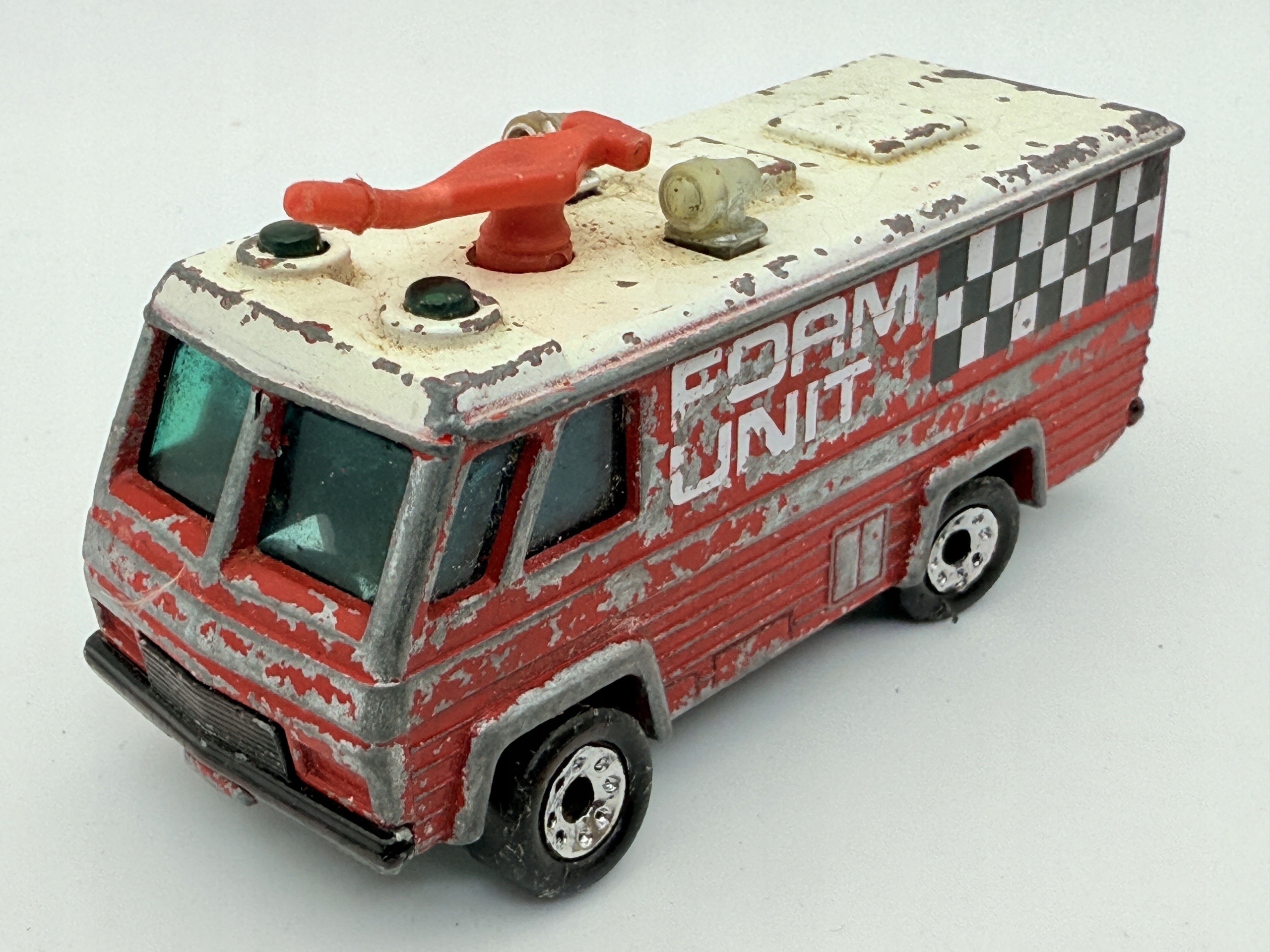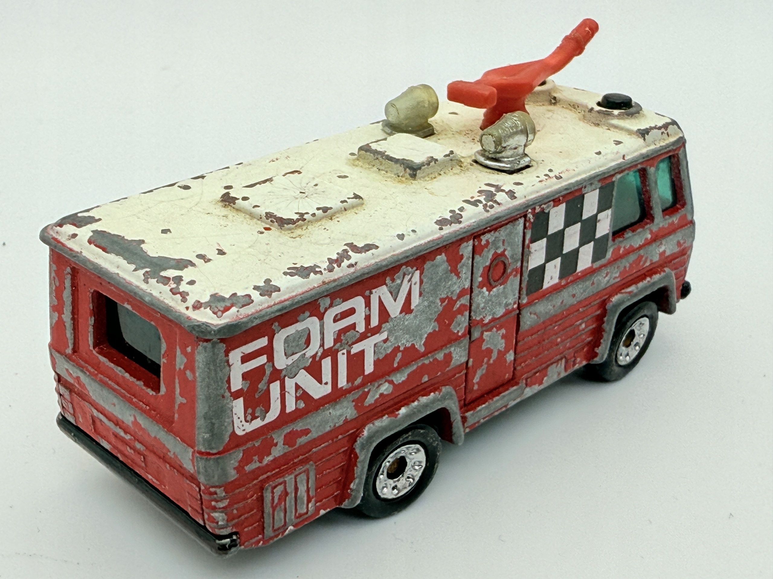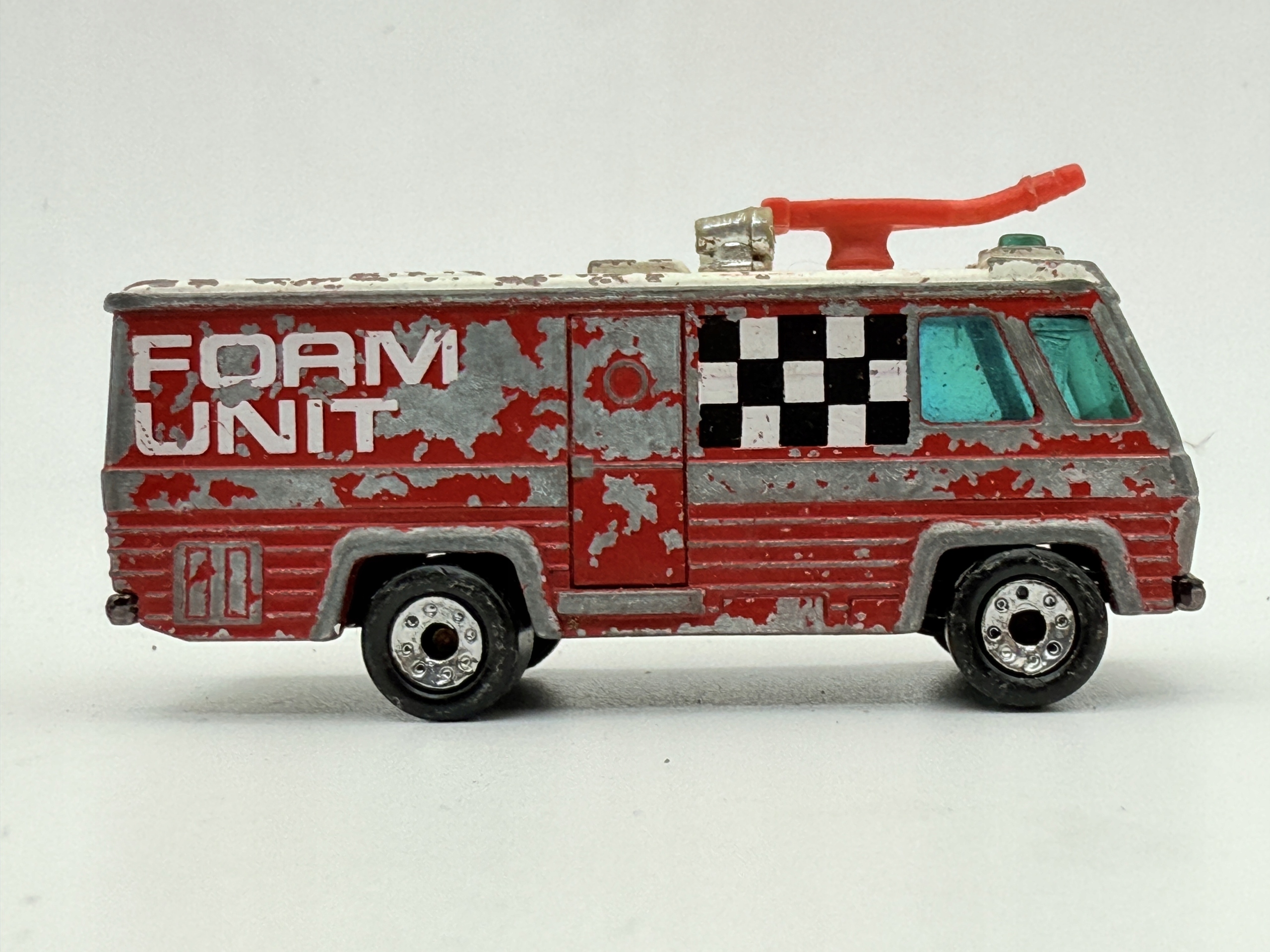 Рятувальна машина «Command Vehicle» від Matchbox — це унікальна рятувальна машина в масштабі 1:64, вирізняється червоним кольором із білим написом «FOAM UNIT» і чорно-білим картатим візерунком.