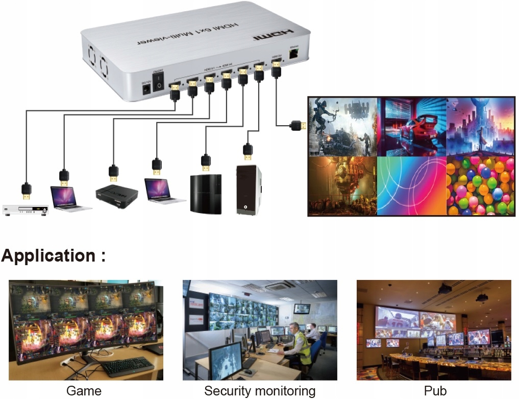 HDMI 6x1 Multi-viewer — це високопродуктивний продукт із шістьма сегментаціями екрана та плавним перемиканням виходу. Він може відображати 6 відеосигналів на одному екрані. Плавне перемикання вхідних сигналів. Способи управління гнучкі, їх можна перемикати кнопками, з'єднанням RS232 або ІЧ-пультом. Це дуже практичний і простий у встановленні перемикач HDMI, його можна використовувати у великих проектах, конференц-залах та інших місцях.