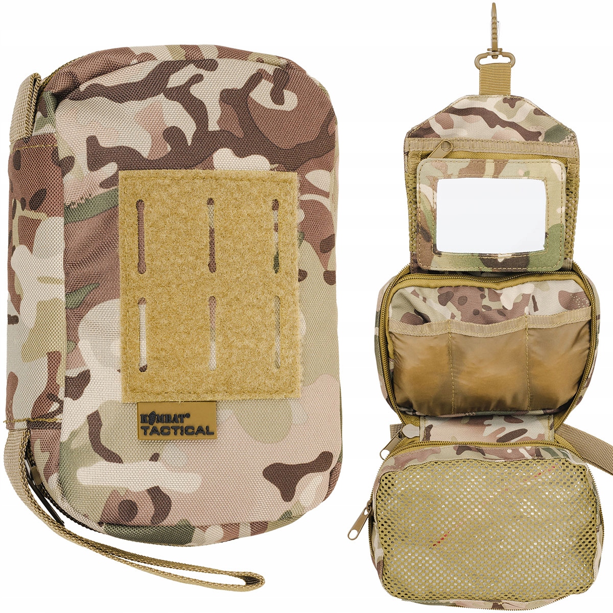 Дзеркало, виготовлене з неймовірного, гнучкого матеріалу. Рама, виготовлена з 600D TAC-TOLY Матеріал. Дзеркало, прикріплене в ріпі, може бути відокремлене і використовувати безпосередньо в руці. Під час транспорту дзеркало ховається в одній з кишень. Карабін з пластику POM, оснащений обертовим ярмо та автоматичною рукою. Модульна панель у системі Molle / PALS, виготовлена з м'якого липучки, адаптована для прикріплення патчів. Модульна система, виготовлена в розширеній технології лазерного вирізання, дозволяє прикріпити косметолога до обладнання або прикріпити додаткові кишені.