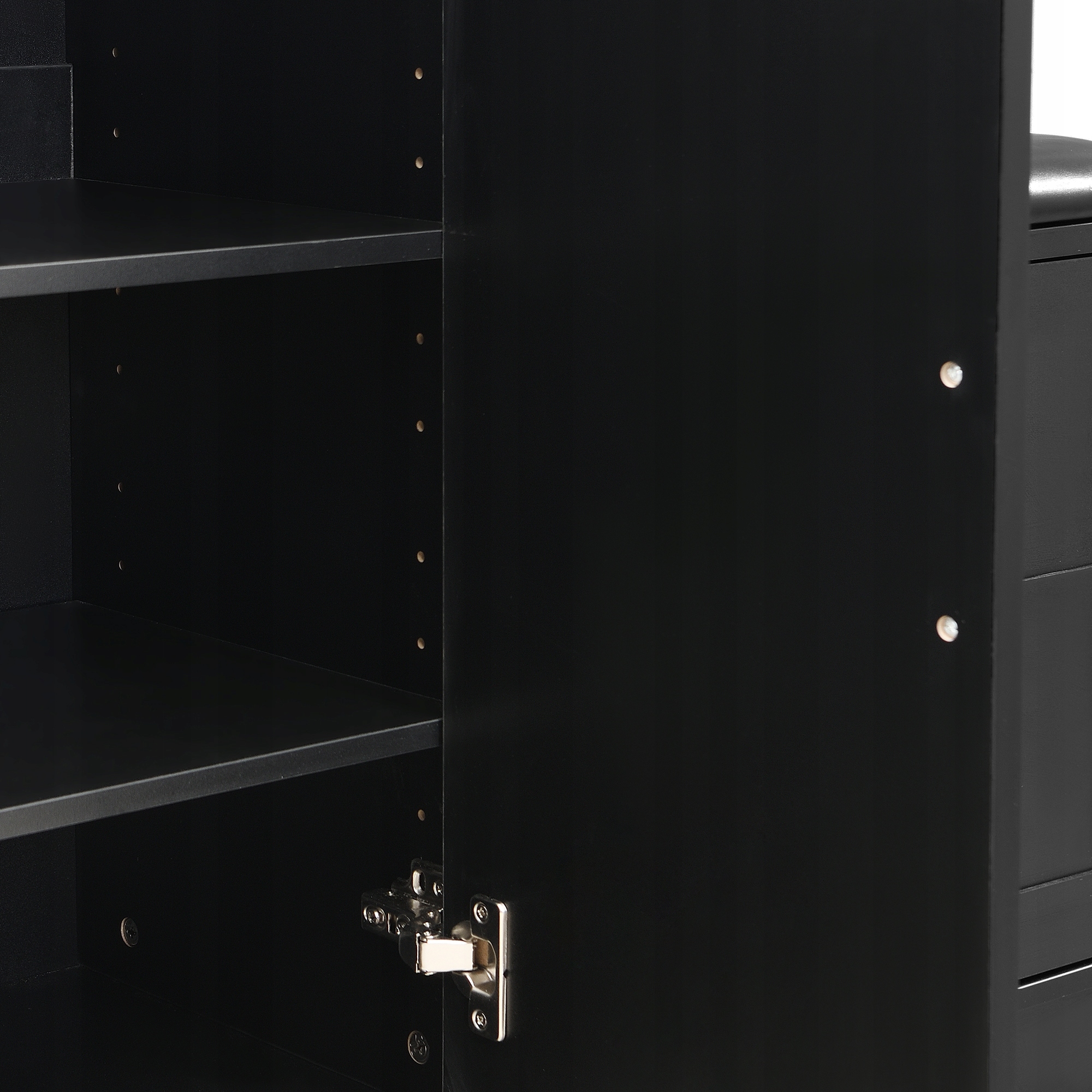 - Ці меблі поєднують у собі функції гардеробу, шафи для взуття, дзеркала для макіяжу та лавки для взуття, забезпечуючи багато місця для зберігання та зручні сидіння, задовольняючи різноманітні потреби зберігання та використання.