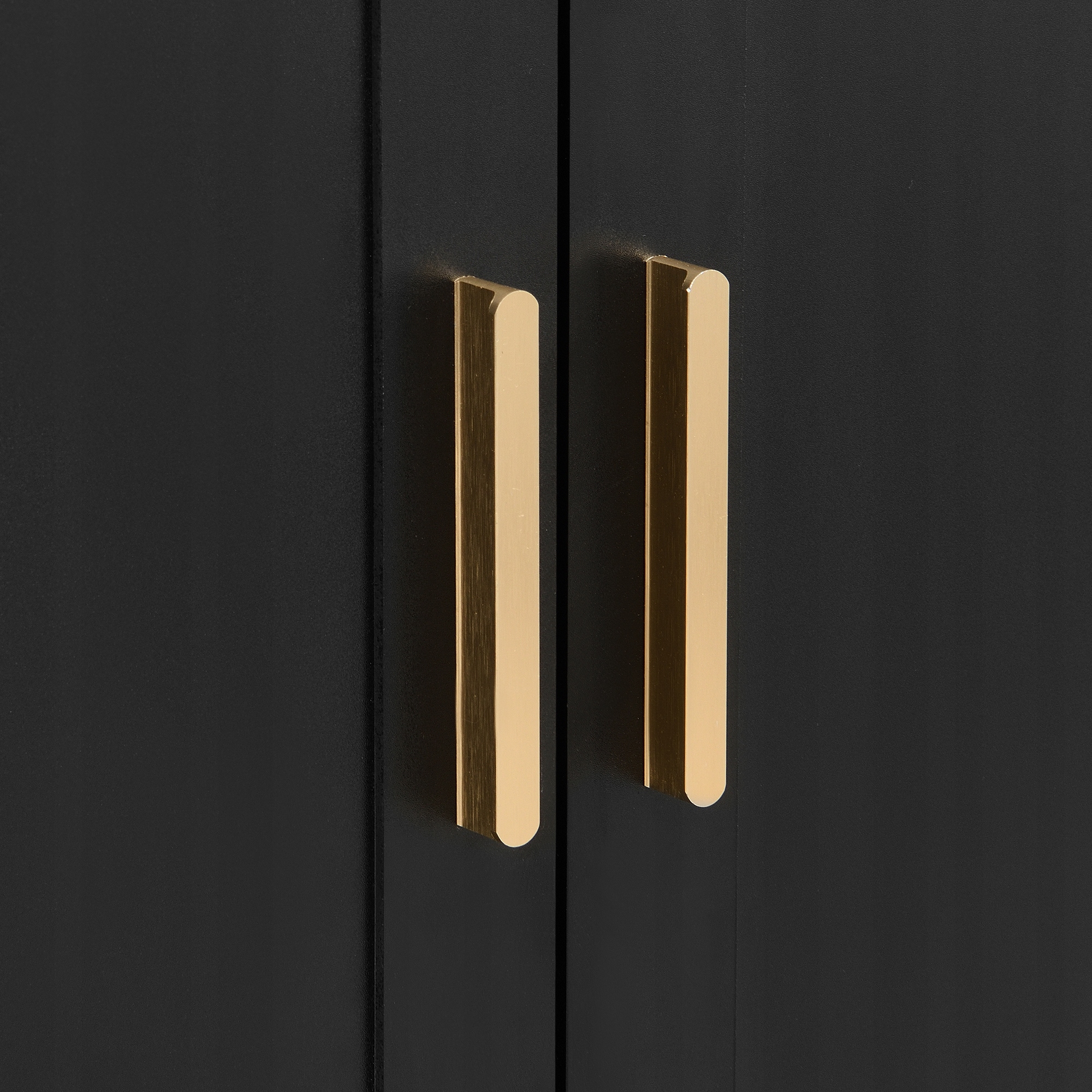 - Сучасний мінімалістичний дизайн із чорними акцентами, заокругленими дверцятами та квадратними ящиками створює вишукану та довговічну естетику. Компактний дизайн і невеликий розмір ефективно економлять простір.