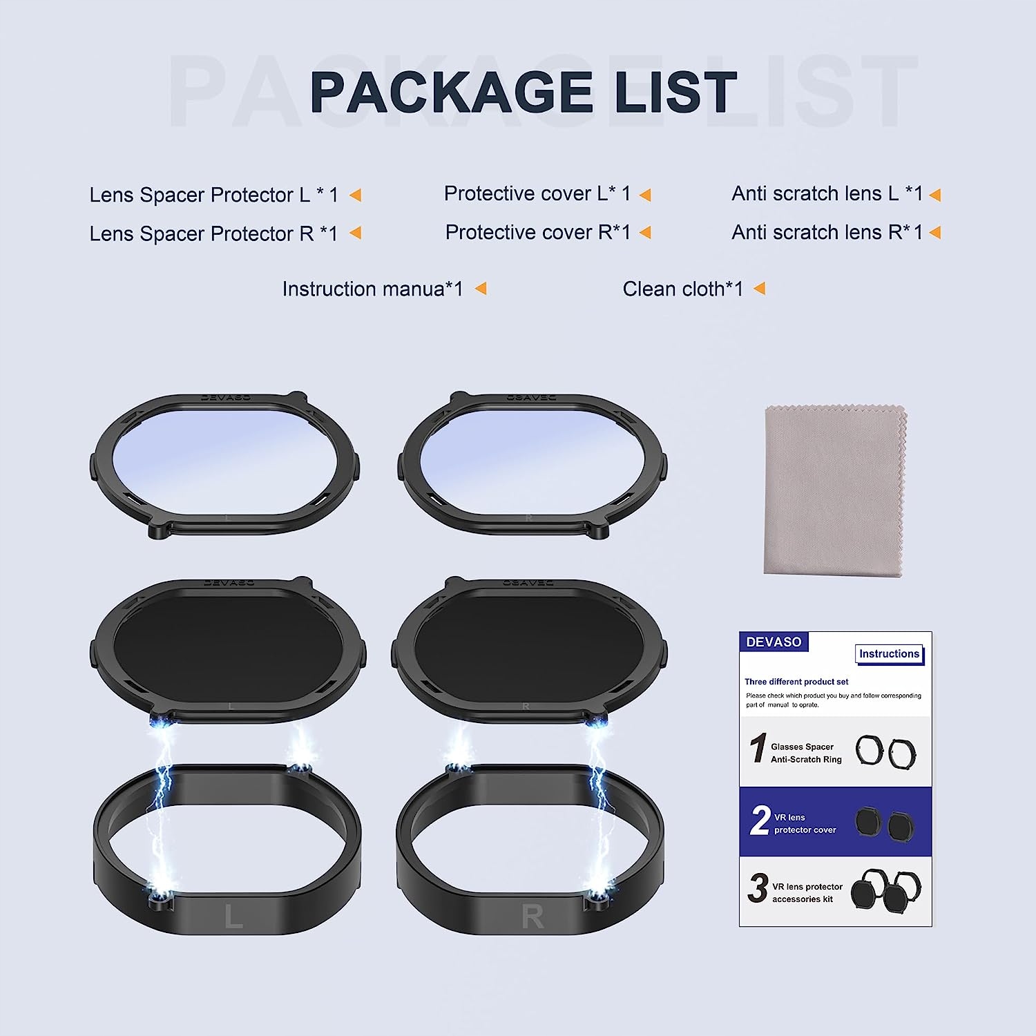 Пакет включено. Наша кришка для об’єктива PSVR2 постачається з 2 кришками-розпірками для окулярів, 2 окулярами, що блокують синє світло, 2 захисними кришками для об’єктивів, 1 посібником користувача, 1 чистою тканиною.
