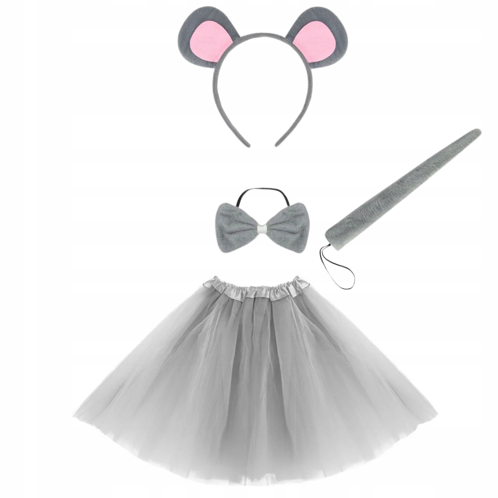 Костюм Мишки - це чарівний і кумедний набір костюмів, ідеальний для карнавальних балів, вистав або тематичних вечірок. Цей костюм із чотирьох предметів включає все, що вам потрібно, щоб перетворитися на милу мишку. Складається з фатинової спідниці сірого кольору, пов'язки з вушками, хвоста на гумці та краватки-метелика на резинці.
