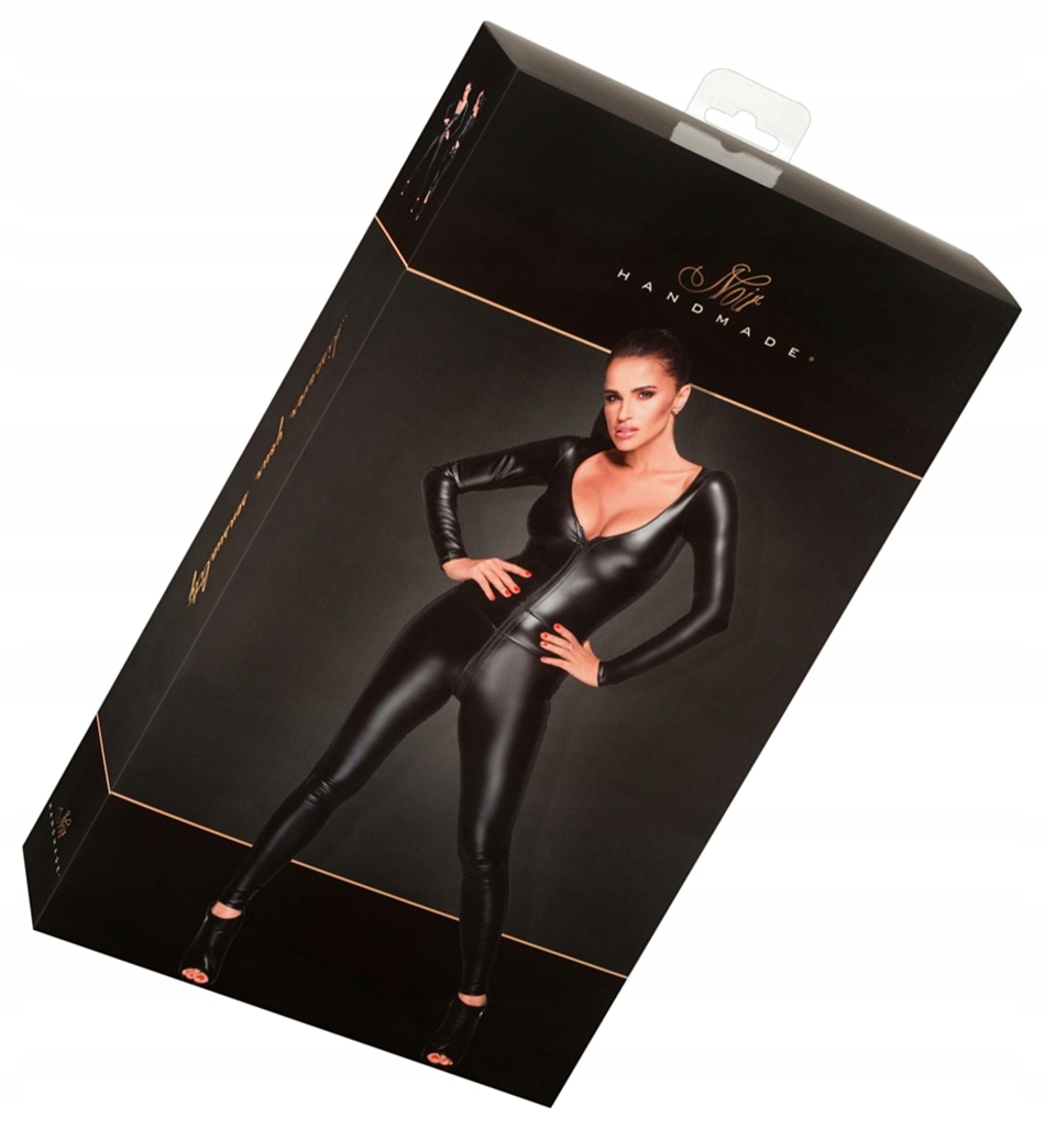 Еластичний комбінезон з довгим рукавом, приталеного крою, чорного кольору з благородним зовнішнім виглядом powerwet. Практична двостороння блискавка проходить від декольте через промежину до оголеного трикутника над сідницею та спонукає до любовної гри.