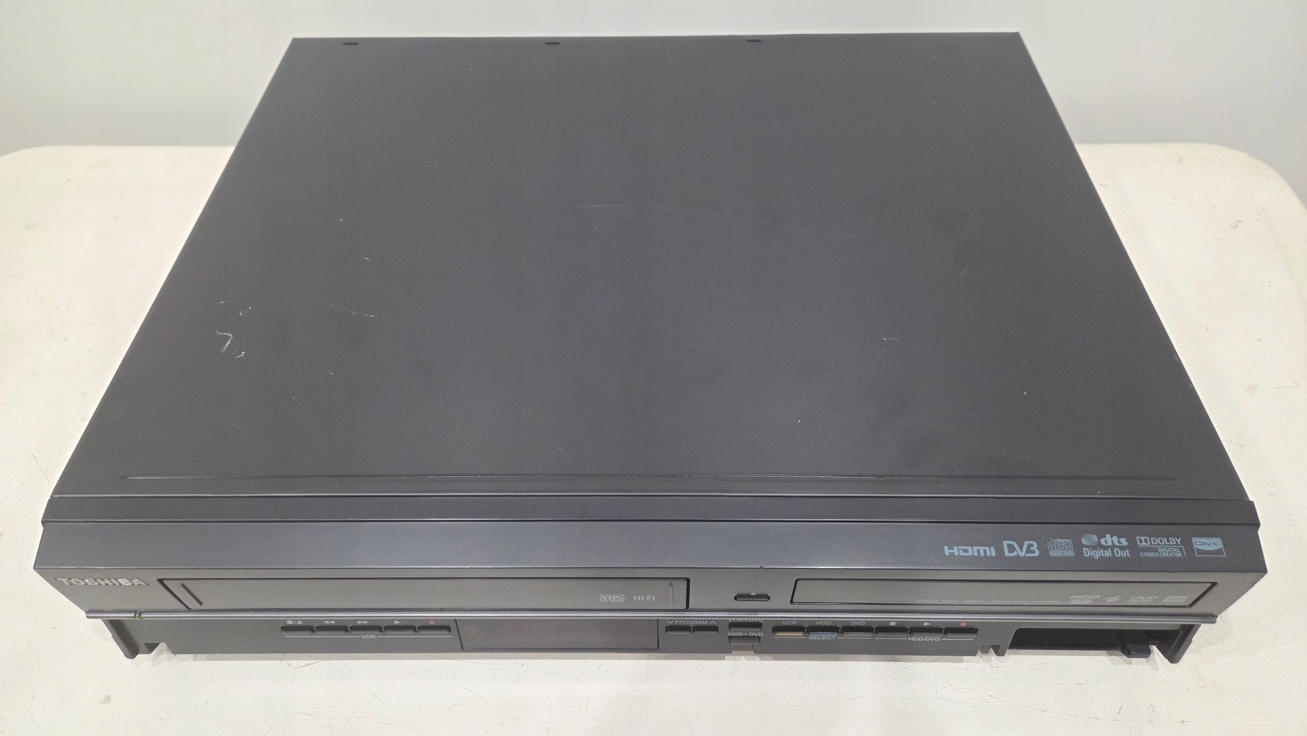 Унікальний універсальний зернозбиральний комбайн від Toshiba. Одна з найвищих і найдосконаліших моделей цього виробника, яка свого часу конкурувала з найдорожчими моделями Panasonic і технічно дорівнювала їм. Він дозволяє записувати на вбудований диск, відтворювати та записувати DVD-диски та відтворювати касети VHS. Безліч можливостей при збереженні простоти використання. Тому він може замінити три інші пристрої одночасно.