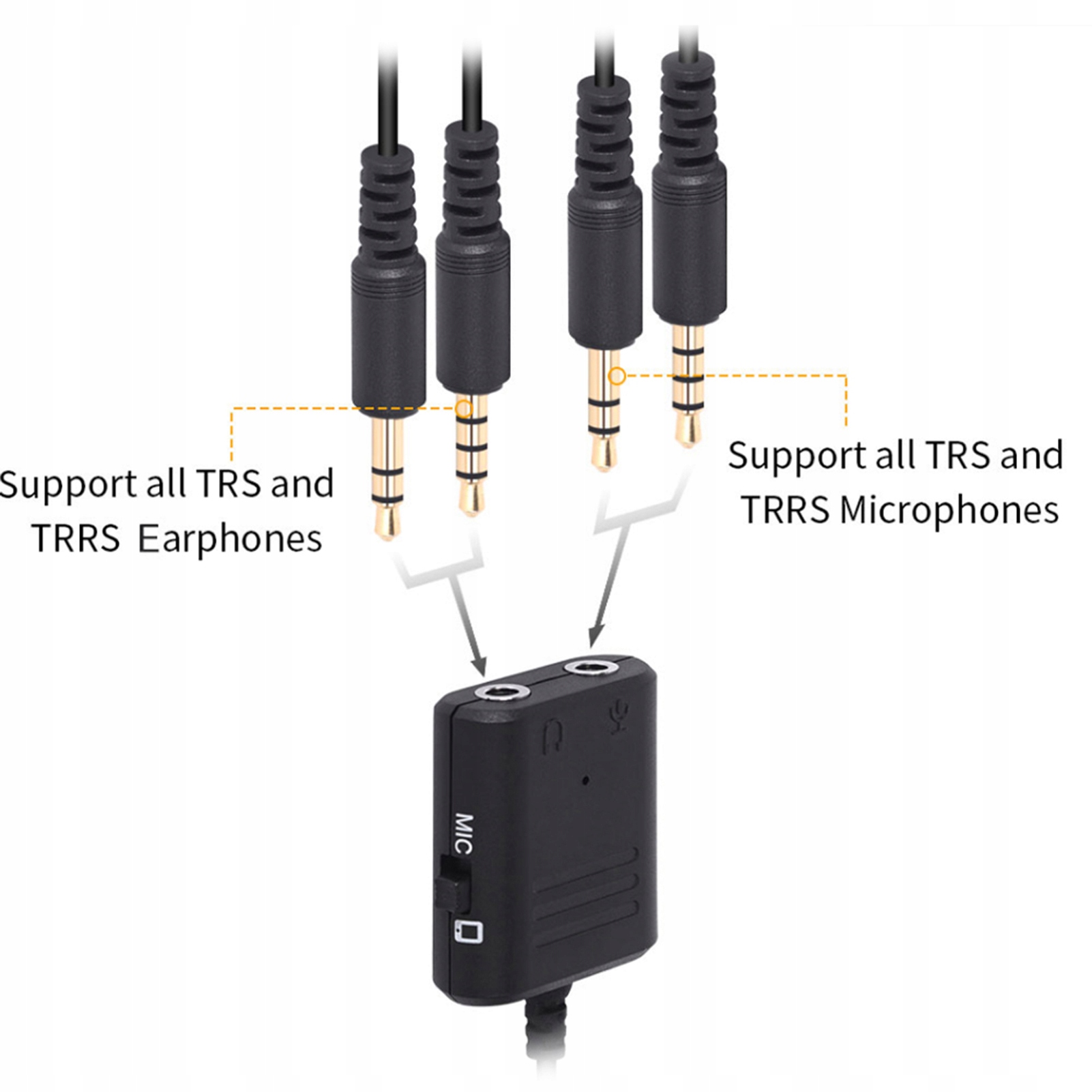 1. Адаптер аудіокабелю має кнопку перемикання мікрофона/телефону. Просто переключіть потрібний режим на основному корпусі кабельного адаптера. Сумісний з 3,5 мм для TRS та TRR, перетворених у C.