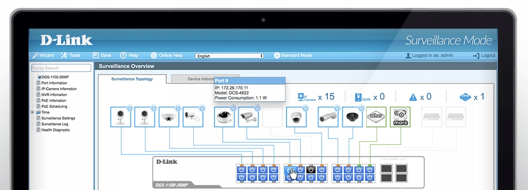 Виберіть режим спостереження в графічному інтерфейсі користувача, щоб користуватися простими у використанні функціями спостереження, які також дозволяють легко керувати мережею спостереження. Пристрої, що входять до складу системи захисту, автоматично виявляються та групуються у виділену VLAN Auto Surveillance, завдяки чому пов’язаний із моніторингом трафік захищений і передається без перешкод.