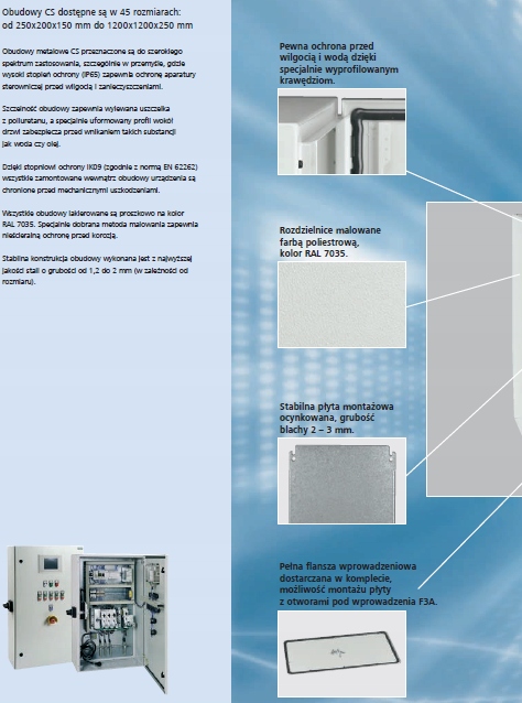 Універсальні корпуси CS поставляються зі стійкою монтажною пластиною товщиною 2–3 мм (залежно від за розміром). Рівень захисту IP66 гарантується поліуретановою прокладкою навколо дверцят. Шафа також містить вхідний фланець, який закриває кабельний ввід. Шафи доступні в 45 розмірах. Універсальні корпуси серії CS замінили шафи типу GK-W.