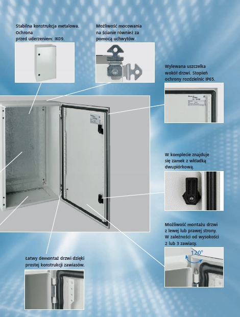 Стійкий корпус з листового металу товщиною 1,2 мм, з ширини 600 товщиною 1,5 мм, з розміром 1000x600 товщиною 2,0 мм. і зварені. На задній стінці є отвори для кріплення на стіні діаметром 10 мм. щити від розмірів 400х400. Двері відкриваються вправо на кут до 120° Легкий демонтаж петель дозволяє монтувати двері з правого або лівого боку. Петлі приховані в корпусі. Герметичність корпусу і дверей забезпечується завдяки прокладці з поліуретану. Усі корпуси мають профілі по вертикальних краях дверей з монтажними отворами через кожні 25 мм.