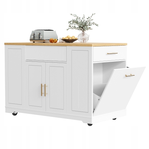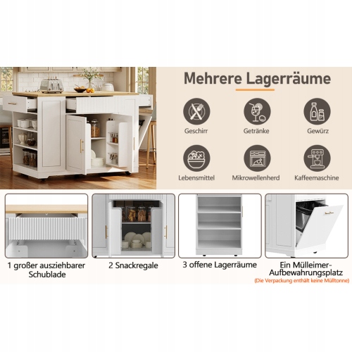 Стійкість: дверні ручки та ручки ящиків виготовлені з високоякісного металу, є естетичними та стійкими до іржі. Вся коляска виготовлена з високоякісного ДВП середньої щільності (МДФ), що робить її довговічною та легкою для чищення. П'ять коліщаток, що обертаються на 360 градусів, у тому числі два з замками, забезпечують гнучке використання в різних місцях. Прекрасний дизайн: шафи мають повністю біле покриття, що надає їм стильного та мінімалістичного вигляду в поєднанні зі стільницею з текстурою дерева. Це гармонійне поєднання гарантує, що меблі ідеально вписуються в сільські кухні, балкони, вітальні, їдальні тощо.