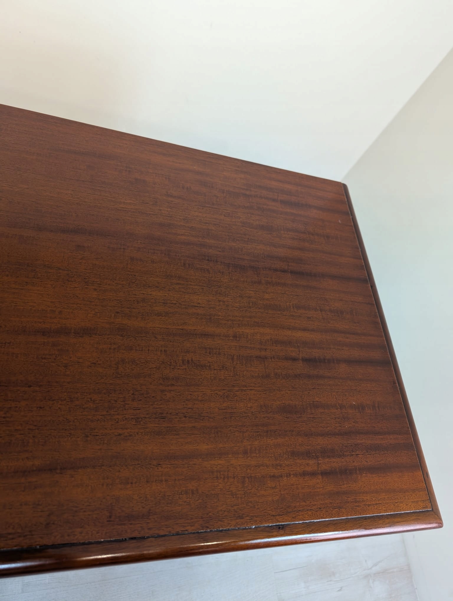 Стильний комод в стилі Чіппендейл, виготовлений з червоного дерева. Має дві шухляди та дві тумби, прикрашені різьбленими деталями. Меблі в хорошому стані, придатні для використання вдома чи в офісі.