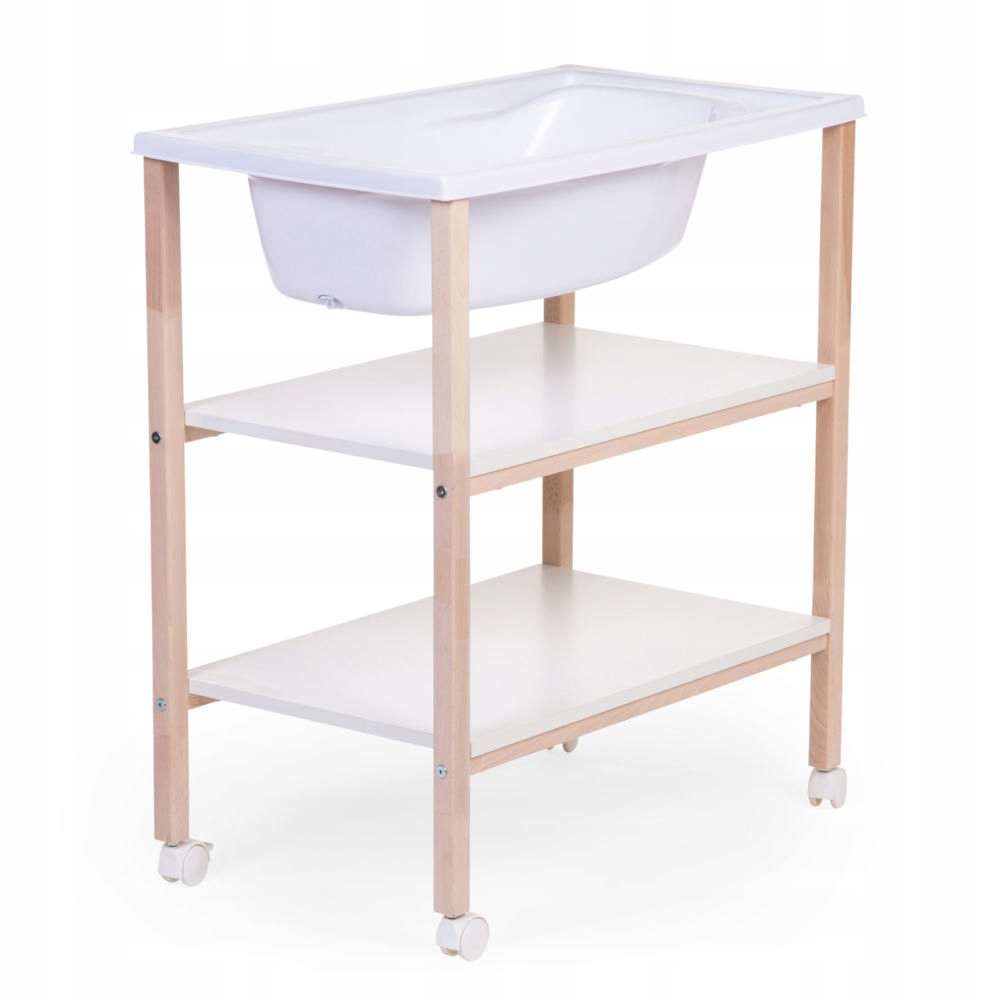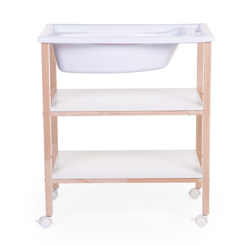 Підняті краї та міцна конструкція пеленального столика роблять його безпечним для дітей вагою до 11 кг. Після купання завдяки коліщаткам підставку з ванною можна легко засунути під пеленальний столик, заощадивши місце в кімнаті. Під ванною є дві практичні полиці, на яких розмістяться всі необхідні для догляду косметичні засоби та аксесуари.