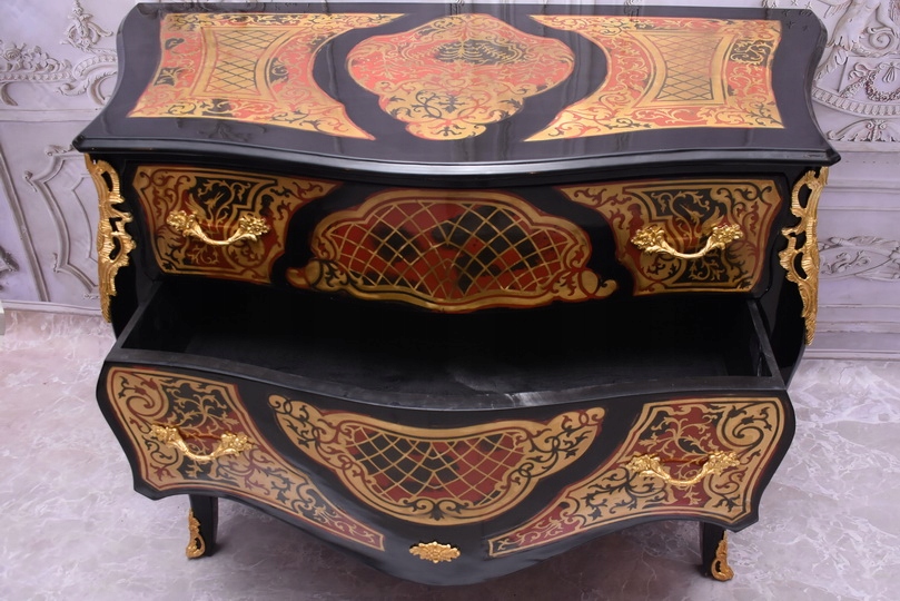 Неймовірно красивий комод BOULLE, багаторазово прикрашений БРОНЗОВОЮ фурнітурою, яка додає чудового шарму меблям. Тверда деревина бука, дуже важка.