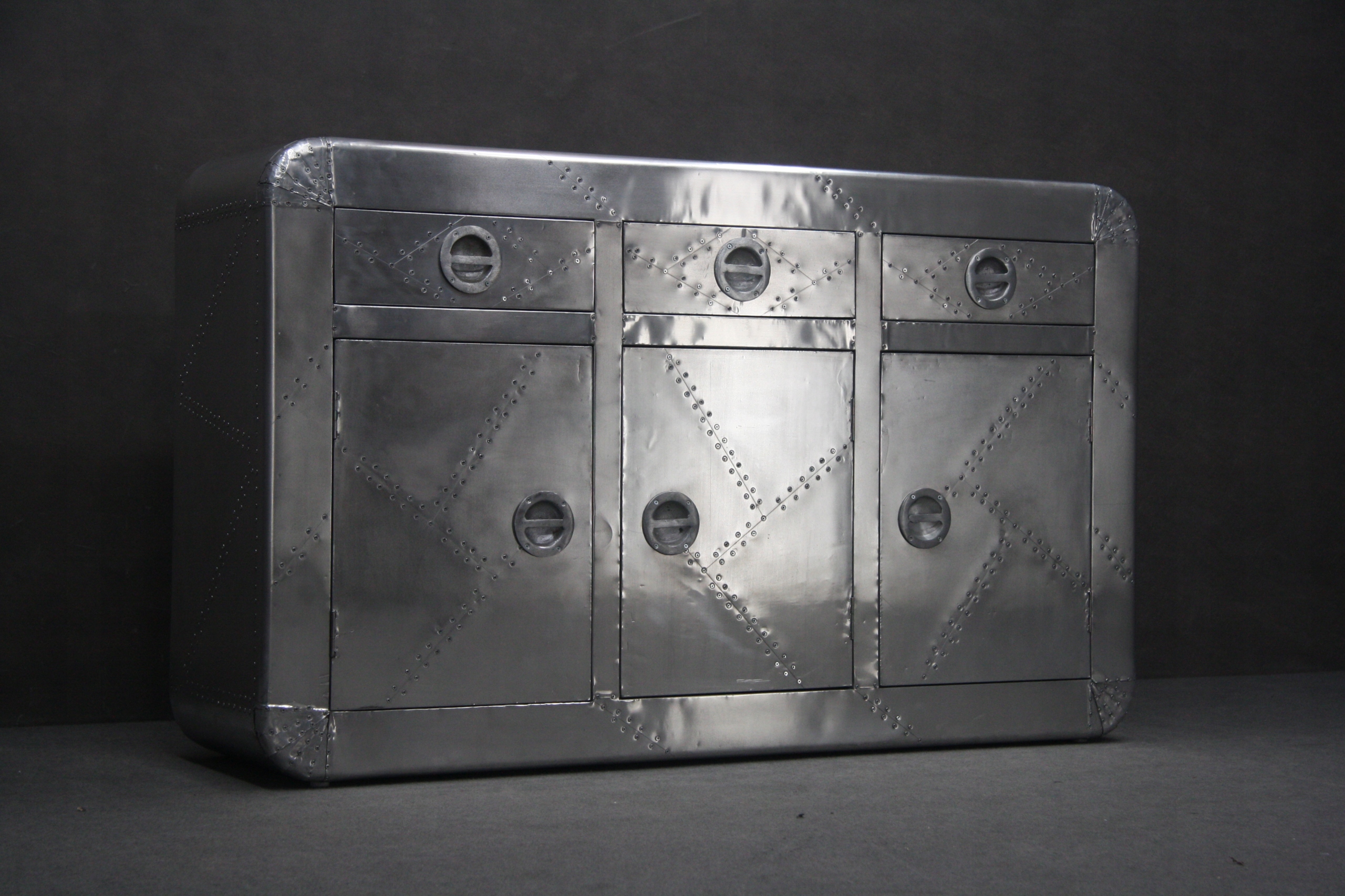 Комод новий. Виготовлений з плити МДФ, покритої полірованим алюмінієм. Специфічне поєднання металевих елементів, що кріпляться гвинтами, і незвичайних ручок підкреслюють індивідуальний і неповторний стиль деталей літака, звідки і назва серії AVIATOR. Кожен предмет меблів унікальний завдяки ручному виготовленню (дрібні подряпини, делікатна оббивка, потертості та різного роду нерівності зроблені навмисно і є природними для цієї серії). Незвичайне поєднання металу і форм приверне увагу і скрасить кімнату, в якій вони розташовані. Унікальний дизайн забезпечує стильний вигляд і може поєднуватися з іншими меблями як окремий елемент декору або як ціла серія, яка доступна на інших аукціонах.