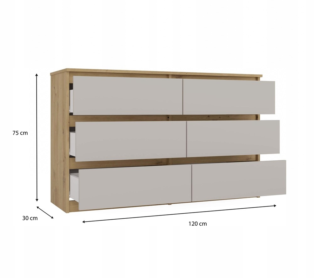 СУЧАСНА КОМОДА НА 6 ЯЩИКІВ СЕРІЯ: MALWA МОДЕЛЬ: M6 120CM КОЛІР: Корпус:ДУБ ARTISAN Спереду: КАШМІР Комод MALWA M6 - це місткий і стильний предмет меблів, який ідеально підійде для спальні, вітальні, дитячої або офісу. Завдяки 6 містким ящикам він забезпечує великий простір для зберігання, полегшуючи організацію одягу, документів та інших аксесуарів. Поєднання корпусу Artisan Oak з мінімалістичними фасадами з кашеміру надає комоду свіжого та елегантного вигляду. Такий дизайн ідеально впишеться як в яскраві, скандинавські інтер'єри, так і в більш класичні або сучасні аранжування. ОСНОВНІ ХАРАКТЕРИСТИКИ ПРОДУКТУ: