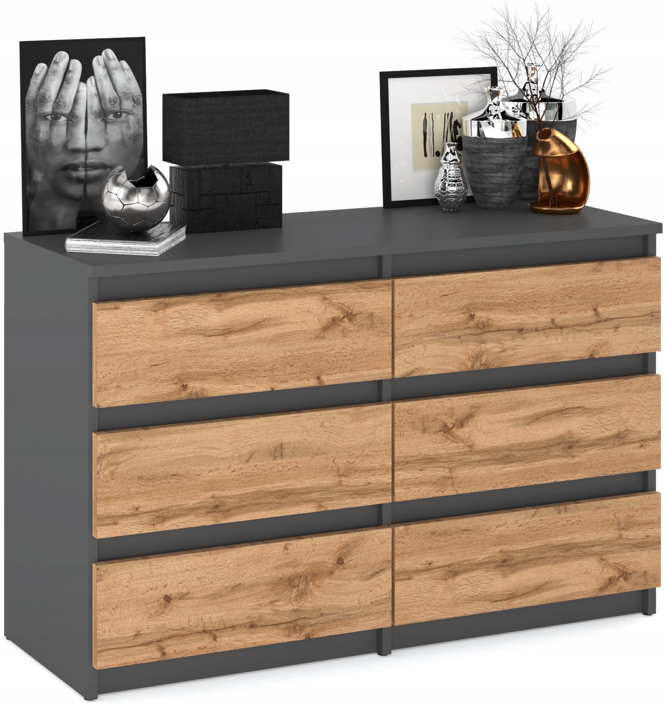 ✔️Стильна елегантність: КОМОД НА 6 ЯЩИКІВ ШАФА - це гармонія кольорів і матеріалів. Сірий колір антрацитових фасадів ідеально контрастує з природною красою дуба Вотан, створюючи предмет меблів, який виділятиме вашу вітальню чи спальню.