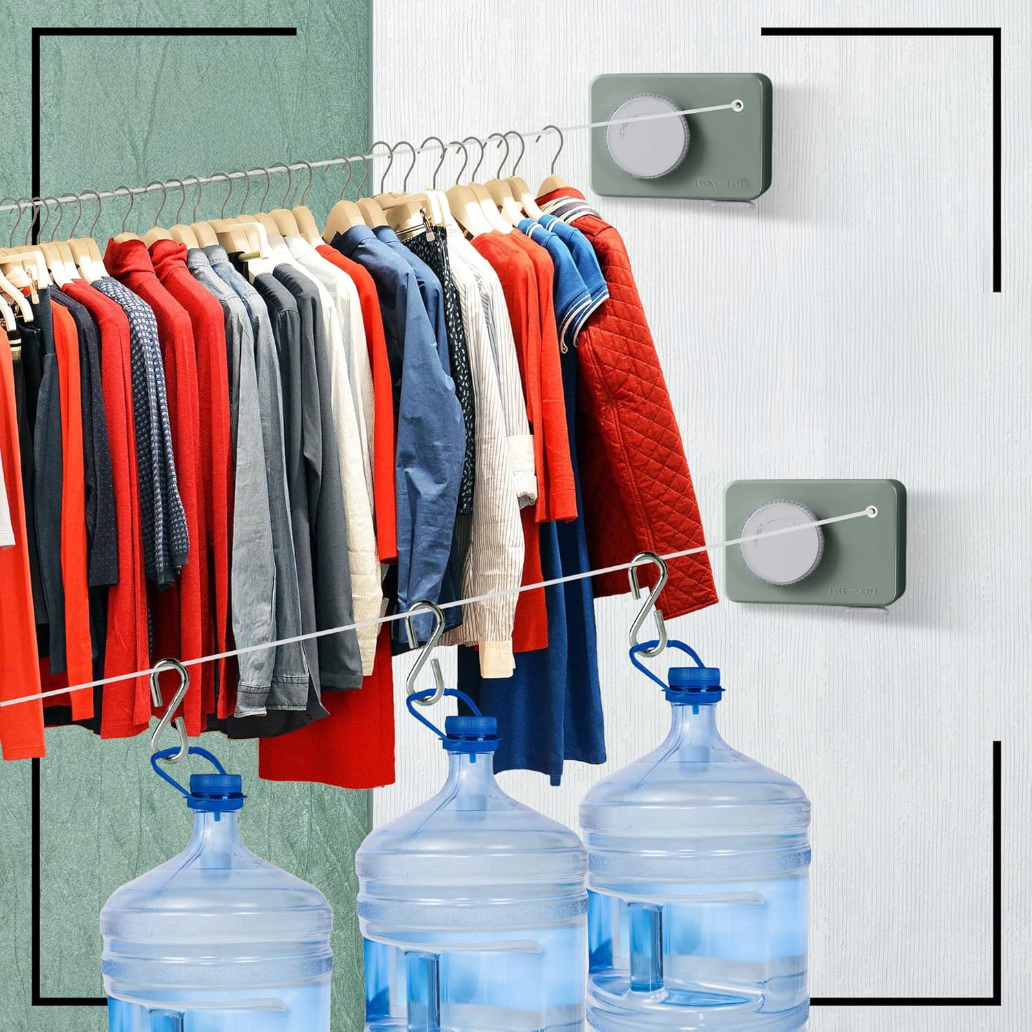- ✔️Простий у використанні: витягніть шнур на потрібну довжину, натисніть кнопку блокування, потім поверніть ручку, щоб натягнути шнур і запобігти його провисанню. Після цього ви можете повісити одяг.