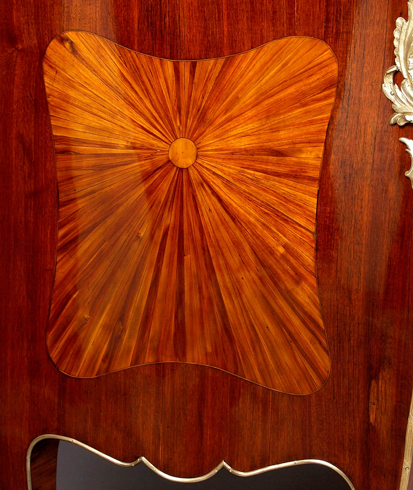 із вигнутими формами, двома шухлядами та мармуровою стільницею вгорі, що підтримується чотирма м’яко вигнутими ніжками. Ящики округлої форми, грані, інкрустовані геометричним візерунком, рясно прикрашені бронзовими аплікаціями у вигляді гілочок, вусиків рослин, черепашок, з масивними шухлядами. Бронзові прикраси також на передніх кутах, більші вгорі, що простягаються вниз за допомогою планок до підніжжя ніг, закінчуючись останньою. Планки також на фартусі і продовжуються на задні ніжки.