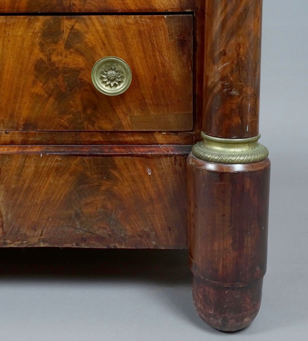 з прямими лініями каркаса, з чотирма ящиками, що спираються на чотири ніжки, передні у вигляді півсфер, задні кутовий. Обабіч комода — точені, трохи звужені вгорі колони, знизу прикрашені кільцем, а вгорі — капітель із позолоченої бронзи, вигравірувана тонкими візерунками. Лицьові сторони трьох ящиків з парою ящиків і ключем посередині, сталевий замок всередині кожного з них. Верхній ящик - найнижчий, виступає вперед, врівень з передньою частиною меблів, відкривається заглибленнями внизу. Стільниця оригінальна мармурова.