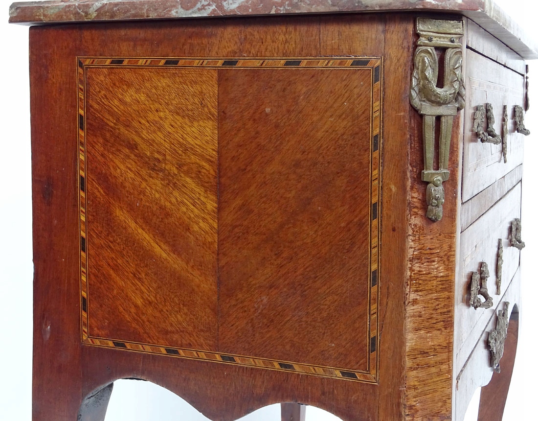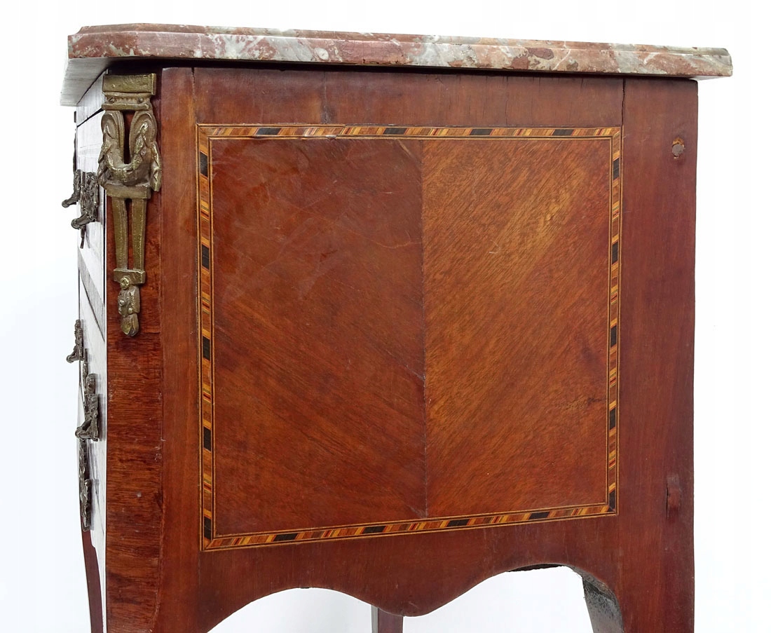 з двома шухлядами та оригінальною мармуровою стільницею, що підтримується чотирма вигнутими ніжками. На гранях шухляд розташована пара шухляд і ключ посередині, всередині врізний сталевий замок, під ним ажурна бронзова аплікація. Передні кути зрізані, прикрашені бронзовими аплікаціями, як і передні ніжки комода. На шухлядах і боках є вставки, діагонально розташовані шпони з різних порід деревини. Стільниця злегка виступає за межі меблів, з витонченою фаскою вгорі.