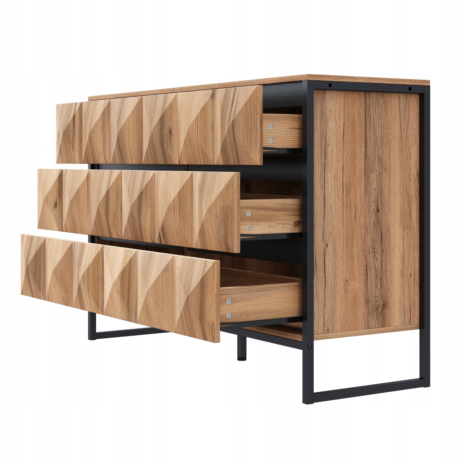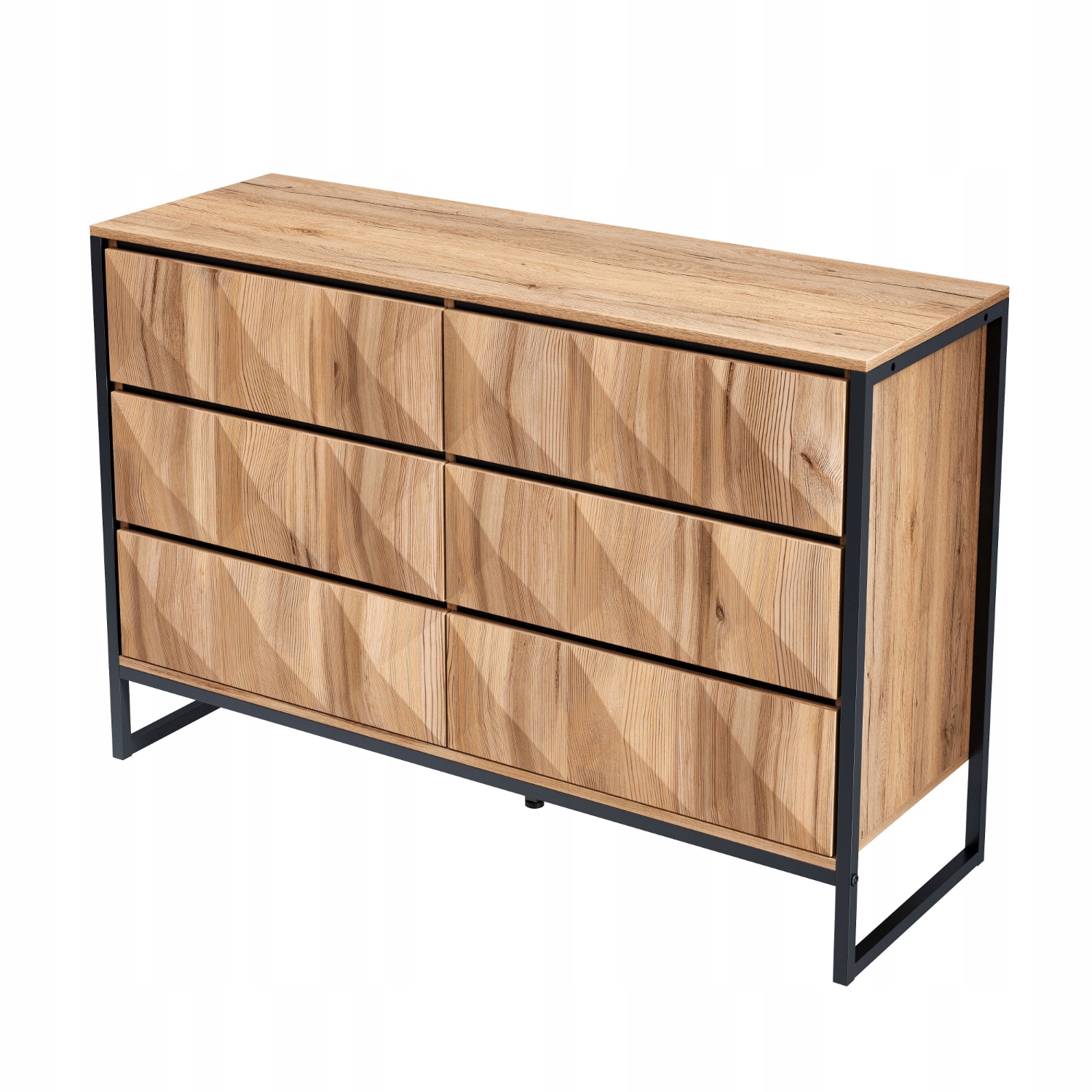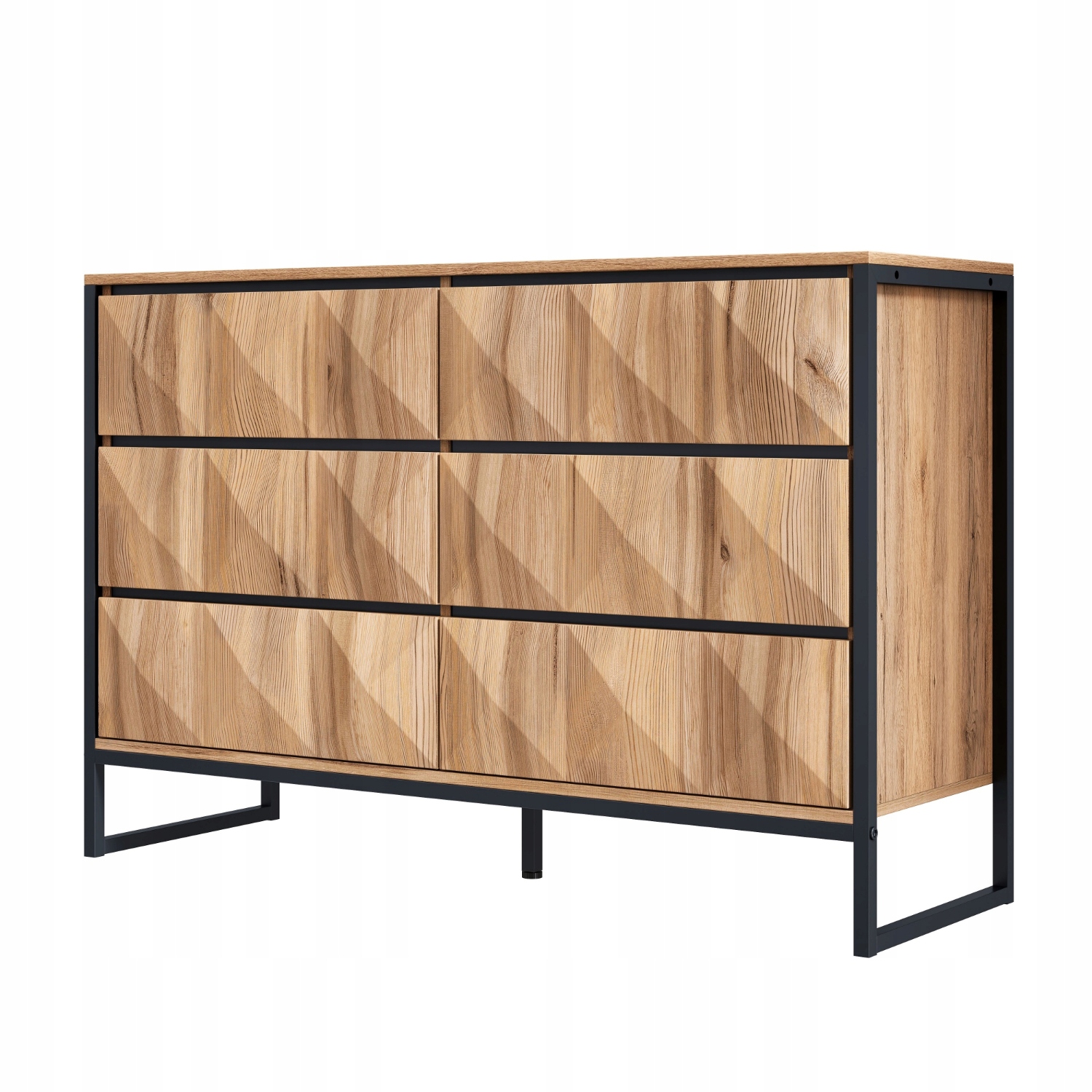 Цей сучасний комод ідеально поєднує в собі практичність і стильний дизайн, що робить його одночасно красивим і функціональним - ідеальний вибір для будь-якого інтер'єру. Шість містких висувних ящиків забезпечують багато місця для одягу, аксесуарів або побутових речей, допомагаючи підтримувати вашу вітальню в порядку та порядку. Кожна шухляда має елегантну чорну декоративну планку, яка вміло приховує ручку, підкреслюючи мінімалістичний вигляд і легкість доступу. Головною особливістю цього комода є його унікальні фасади ящиків з опуклим візерунком, який створює фактурний геометричний малюнок. Під впливом сонячних променів візерунок з часом візуально змінюється, додаючи інтер'єру глибини та характеру. Комод має міцний металевий каркас чорного кольору, що забезпечує міцність і стабільність. Натуральне зерно деревини надає йому виразного промислового характеру. Тепле відтінок дерева доповнює міцну залізну конструкцію, створюючи збалансовану та сучасну естетику, яка ідеально поєднується з різними стилями інтер’єру – від модерну до індустріального. Незалежно від того, де ви розміщуєте його у вітальні, спальні чи холі, цей комод є практичним рішенням для зберігання та стильним елементом декору. Чіткі лінії, натуральні матеріали та художні деталі дозволяють йому стояти окремо або ідеально вписуватися в дизайн інтер’єру. Для людей, які цінують як дизайн, так і практичність, цей комод є ідеальним вибором, підносячи повсякденне зберігання до вишуканого сучасного рівня.